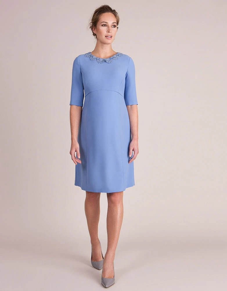 Notre robe grossesse droite en crêpe bleu est une robe incroyablement élégante et bien coupée. Réalisée dans un tissu crêpe fluide de qualité et d’un magnifique bleu lavande, elle drape parfaitement vos nouvelles courbes tout au long de la grossesse et après. Cette robe met en valeur votre taille empire de manière subtile tandis que le col en dentelle crochetée fait de cette robe une robe grossesse chic et féminine, idéale pour vos évènements habillés.