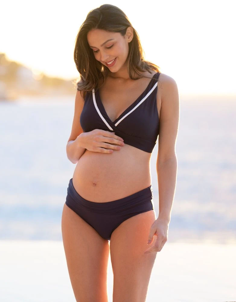 Faites sensation cet été dans cet ensemble de bikini bleu marine d’inspiration nautique. Réglable pour s’adapter parfaitement à chaque semaine de grossesse (et au-delà !), cet ensemble élégant peut être porté comme un modèle taille haute ou rabattre la bande de protection vers le bas pour une coupe plus basse.