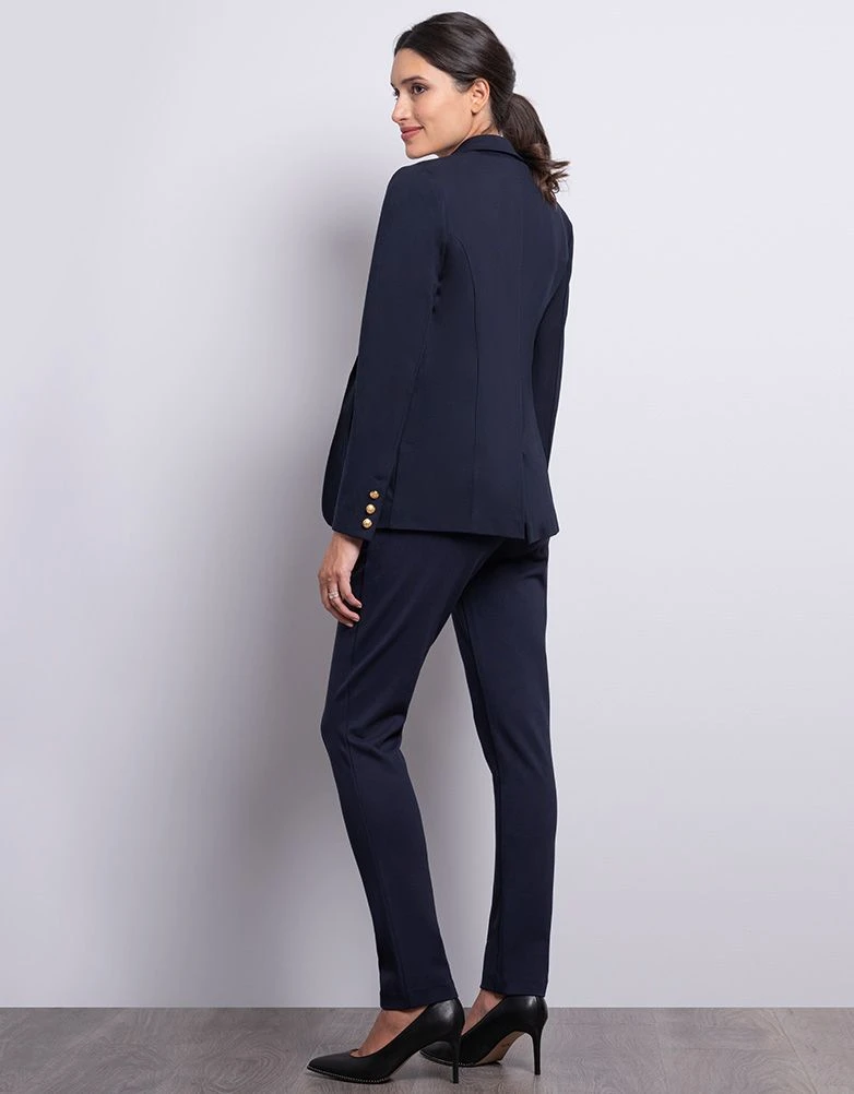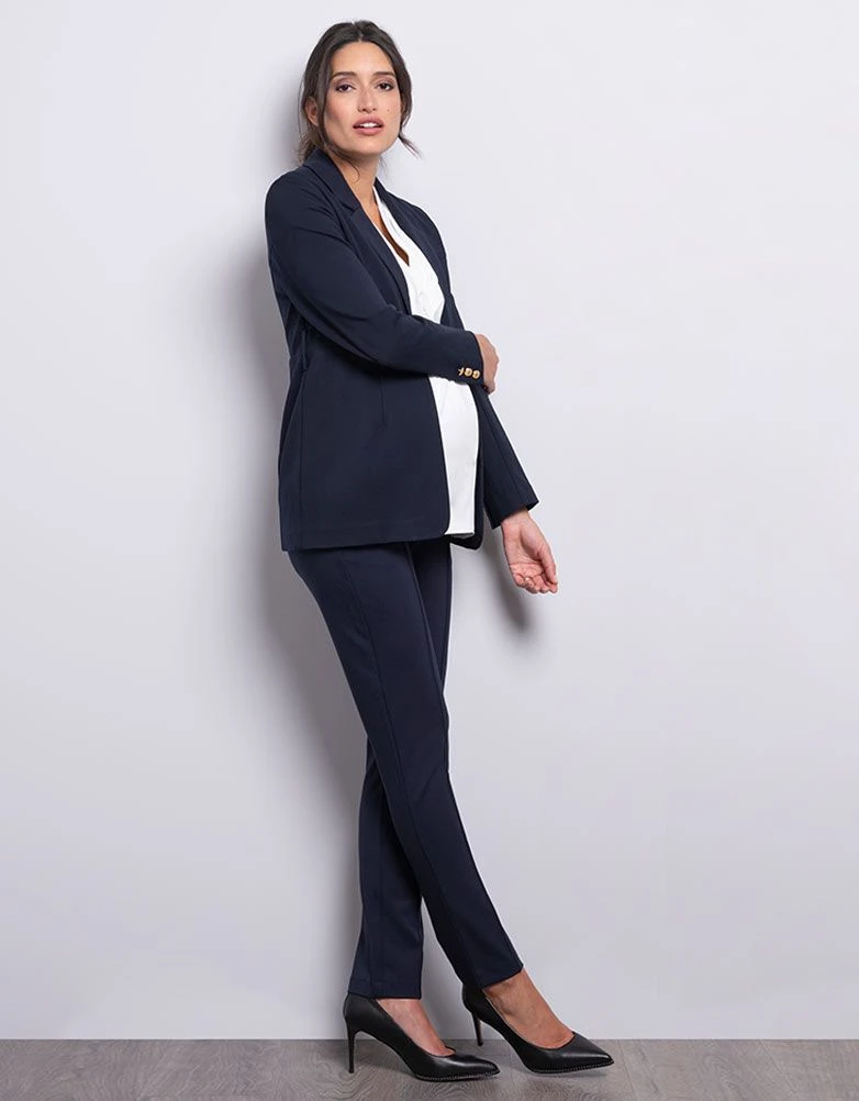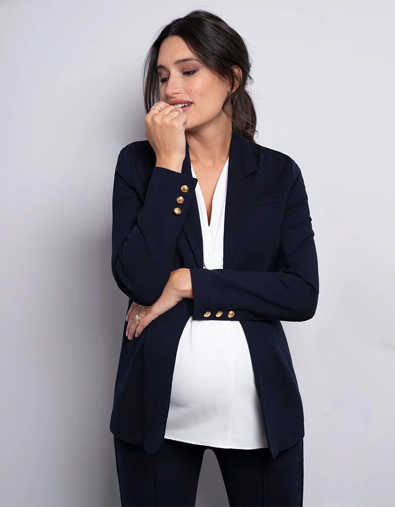 Notre blazer de grossesse bleu marine offre une coupe flatteuse ce qui en fait la veste parfaite pour vous accompagner à chaque étape. Conçu dans un jersey en Ponte, ce blazer sublime vos nouvelles formes tout en étant assez strech pour qu’il vous accompagne pendant vos neuf mois. Des boutons dorés sur les manches y ajoutent une touche mode. Le blazer idéal pour avoir un look working girl au bureau pendant votre grossesse.