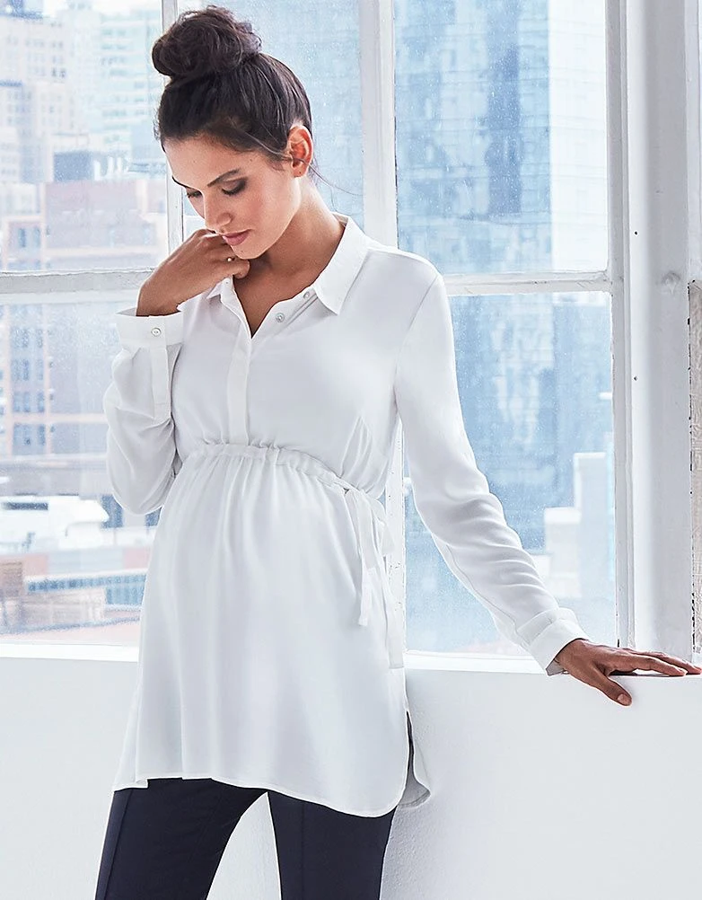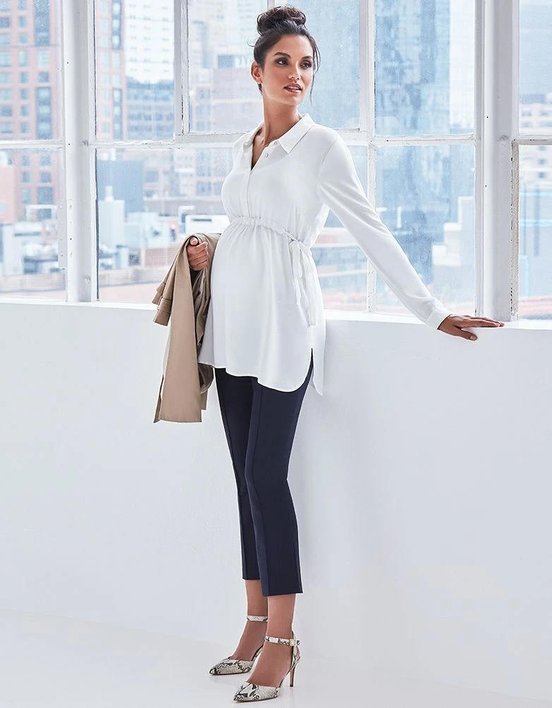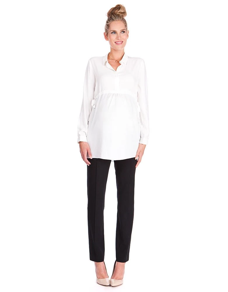Chic et décontractée, notre sublime blouse grossesse à nouer couleur ivoire est une jolie pièce à avoir dans sa garde-robe. En viscose ultra douce, cette jolie blouse en vogue drape joliment vos courbes et est super agréable à porter. Un simple cordon à nouer sur les côtés permet de cintrer la blouse et de marquer une belle taille empire. Après que bébé soit né, les boutons sur le devant permettent de faire de cette blouse une parfaite transition dans votre garde-robe maternité. Portez-la avec un pantalon noir classique pour un look chic et sobre ou avec un jean et des boots pour n’importe quelle occasion.