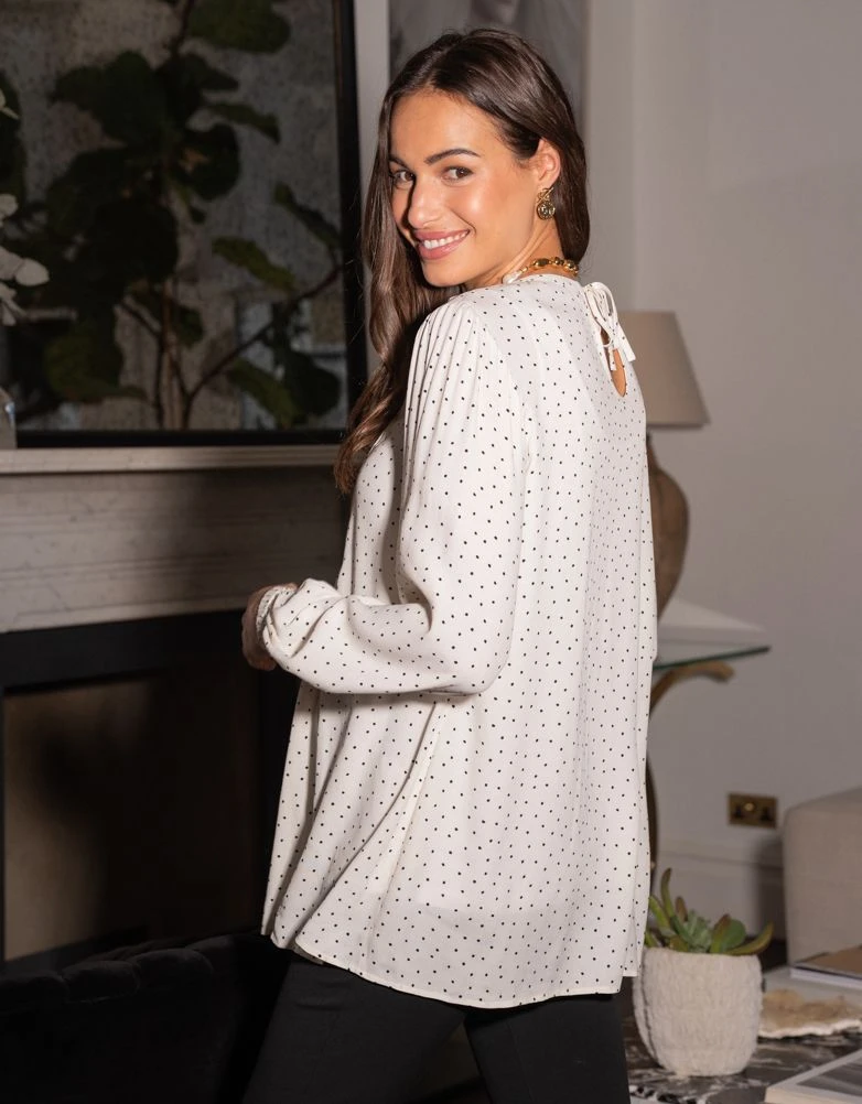 Idéale au bureau comme à la maison, notre blouse grossesse et allaitement à pois est une pièce intemporelle qui ne doit pas manquer à votre garde-robe. Confectionnée en viscose tissée ultra-douce, cette blouse à smocks offre beaucoup d’espace à votre ventre qui s’arrondit. tandis que la ceinture à nouer resserre la taille haute, flattant votre silhouette à tous les stades de la maternité. Après la naissance de bébé, de discrètes fermetures éclair vous permettent d’allaiter facilement où que vous soyez. De jolies finitions froncées et un imprimé à pois complètent le look, parfait avec un jean ou un pantalon noir élégant.