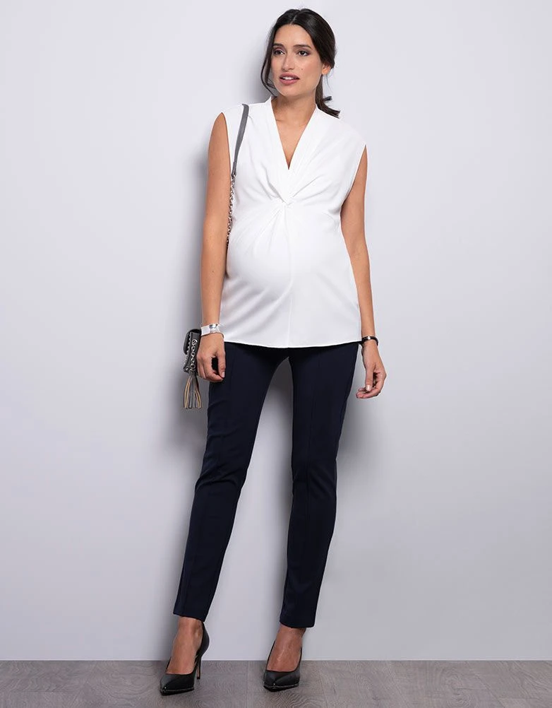 Notre blouse grossesse nouée sans manches blanche est un indispensable dans la garde-robe de future maman. Conçue avec un tissu fluide, cette blouse de maternité drape élégamment vos nouvelles courbes pendant que son detail noué sur le devant marque la taille et sublime votre silhouette de femme enceinte. Portez-la avec un tailleur-pantalon pour le bureau ou avec un jean slim.