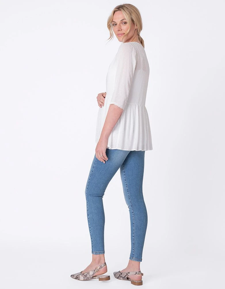 Misez sur cette blouse style romantique texturée à pois, pile dans la tendance pour la grossesse. On aime le style boutonné sur le devant qui permet d’allaiter sans effort après la naissance de bébé. En viscose tissée légère avec une finition plumetis, elle est parfaite superposée avec un jean skinny ou un pantalon cigarette élégant.