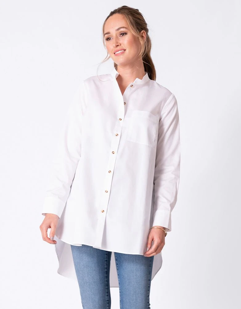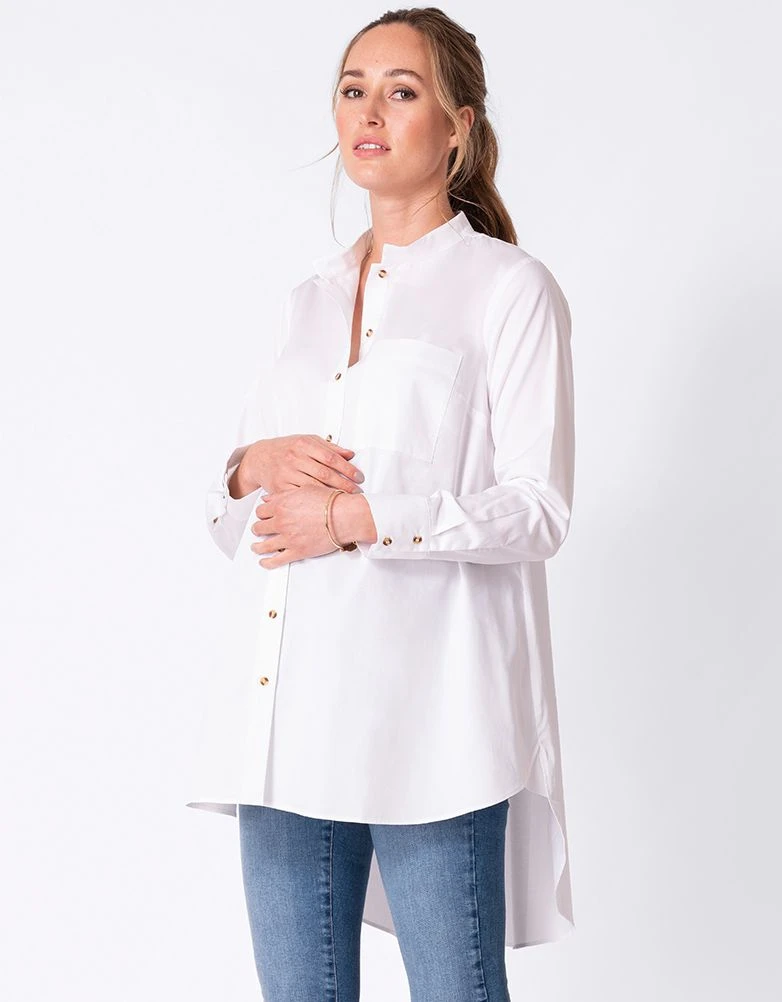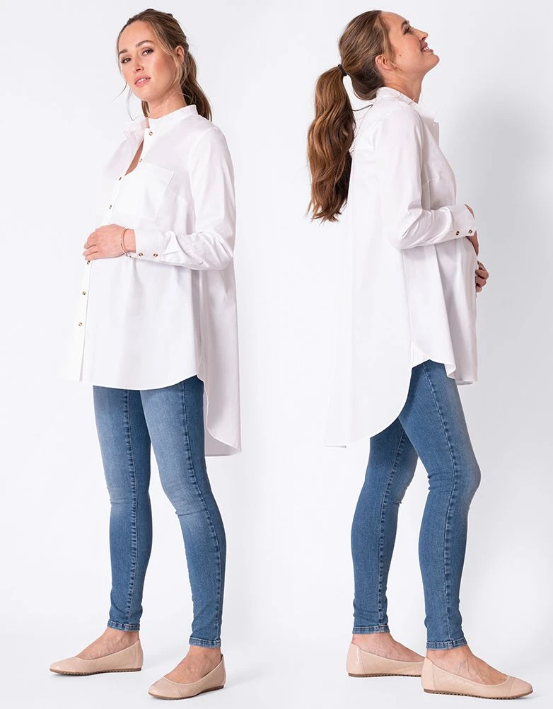 Chic, confortable et classique, notre chemise en coton blanc est parfaite pour chaque étape de la grossesse. Sa coupe longue à l’arrière très tendance permet de couvrir vos courbes et de vous sentir à l’aise. Un col mandarin et des manches élégamment boutonnés complètent le look. L’accès facile à l’allaitement en fait également un vêtement idéal pour après la naissance de votre tout petit. Portez-la avec un legging ou un jean slim pour un look stylé au quotidien.