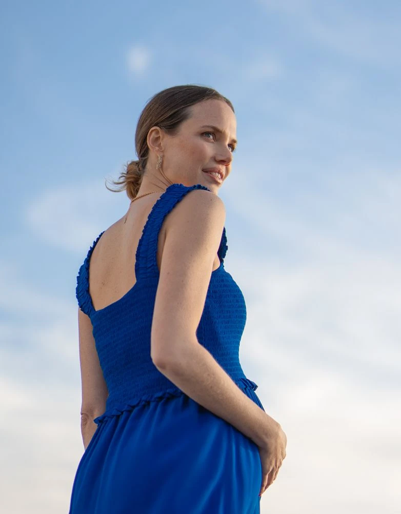 Combinaison grossesse Oh Hello de rêve ! Combinaison confort par excellence, notre combinaison grossesse et allaitement à jambes larges bleu cobalt est un ensemble facile à porter. Fabriquée en viscose tissée de qualité supérieure et dotée de bretelles élastiques pratiques, elle est conçue pour s’adapter à vos courbes en constante évolution. Après la naissance de votre bébé, le corsage flatteur froncé se soulève pour révéler un accès facile et discret à l’allaitement. Vous pouvez donc continuer à porter cette élégante combinaison une pièce bien après la date prévue de votre accouchement. Habillez-la de talons et d’un blazer ou de baskets et de lunettes de soleil… dans tous les cas, vous êtes gagnant !