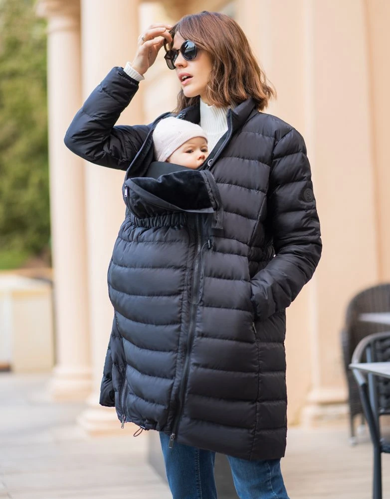 À l’arrivée de bébé, grâce aux fermetures éclair, il vous suffira d’ajouter la poche kangourou, doublée de fausse fourrure, pour la porter sur votre porte-bébé ou votre écharpe. Ainsi, vous et votre bébé resterez bien au chaud.