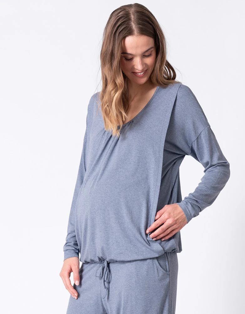 Confectionné dans le jersey stretch le plus doux, cet ensemble de loungewear de grossesse et d’allaitement bleu barbeau offre le meilleur du confort à chaque étape. Son pantalon ajustable, vous permet de le porter sous ou sur votre ventre, et après la grossesse également. Porté comme un pyjama confortable ou pour se détendre à la maison, cet ensemble de maternité ultra-doux est un must pour les nouvelles mamans et les futures mamans.