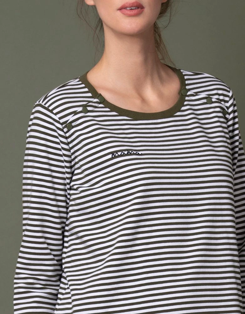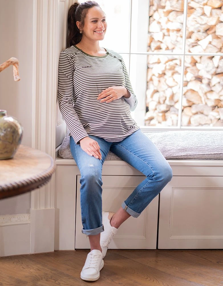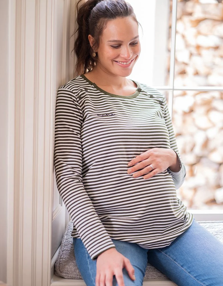 Un classique à rayures avec un accès ingénieux pour l’allaitement et un adorable petit motif ‘mama’. Notre haut de grossesse et d’allaitement rayé Mama est parfait pour être porté avec un jean ou une salopette. Réalisé en coton stretch doux, ce modèle est agréable à porter et évolue avec vous tout au long de la grossesse. Après l’arrivée de bébé, des boutons-pression s’abaissent sur le devant pour faciliter l’accès à l’allaitement. Brodé sur le cœur, l’écrit ‘mama’ y a apporte une touche finale discrète.