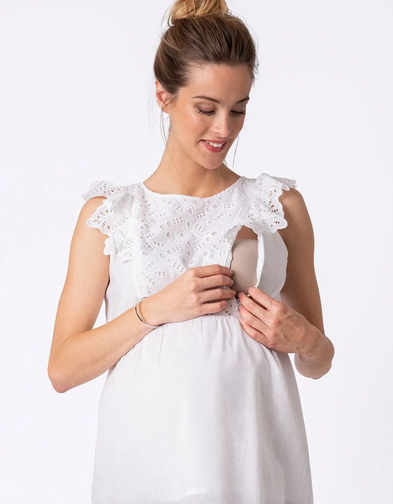 Ce haut de grossesse et d’allaitement avec de la broderie Anglaise est un incontournable des mois les plus chauds. 100% coton, il est lĂ©ger et doux contre votre peau, enrobant magnifiquement sur votre silhouette Ă chaque Ă©tape de la grossesse. La broderie Anglaise sur le devant ajoute un Ă©lĂ©ment ultra-fĂ©minin, tout en dissimulant un accĂšs Ă lâallaitement discret. Un Ă©lĂ©gant dos ouvert avec des dĂ©tails Ă nouer complĂšte le look. Câest le haut parfait Ă porter avec un jean skinny ou un short en jean.