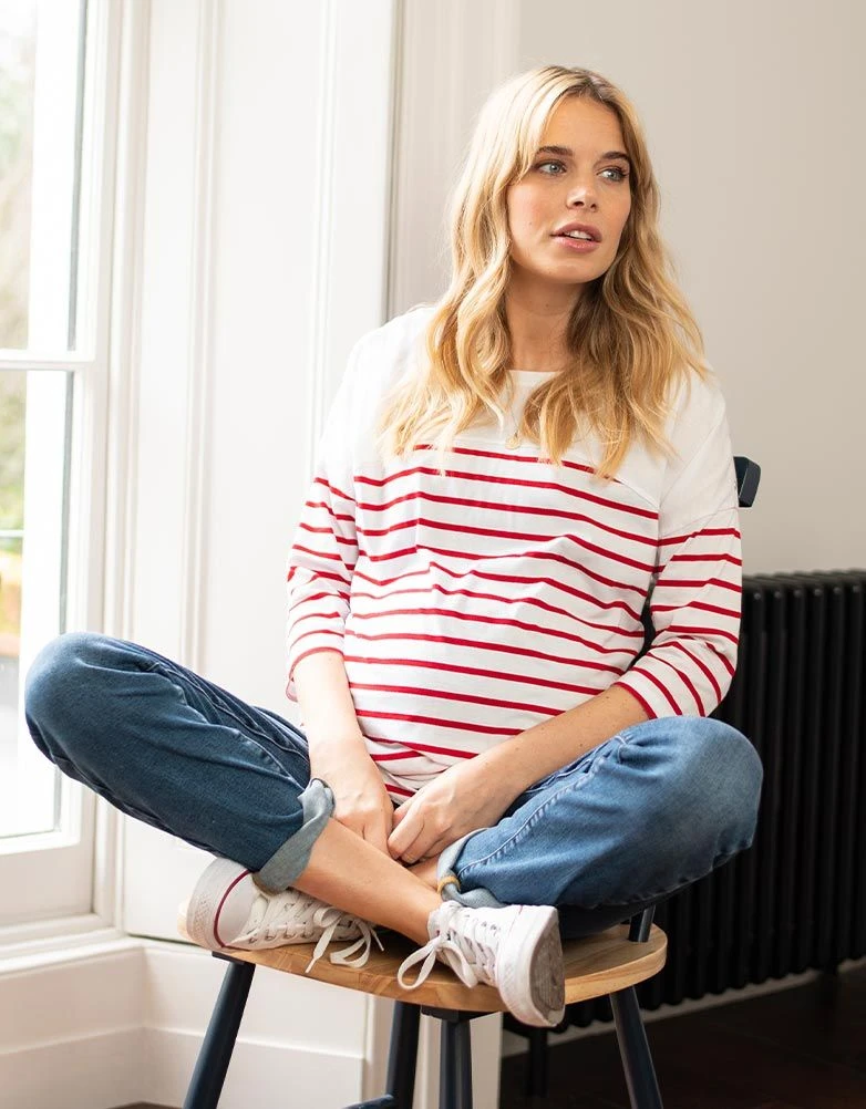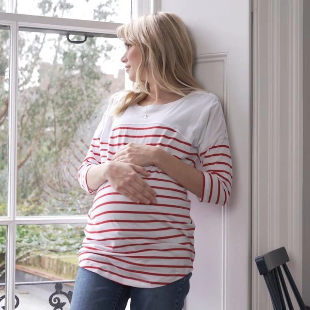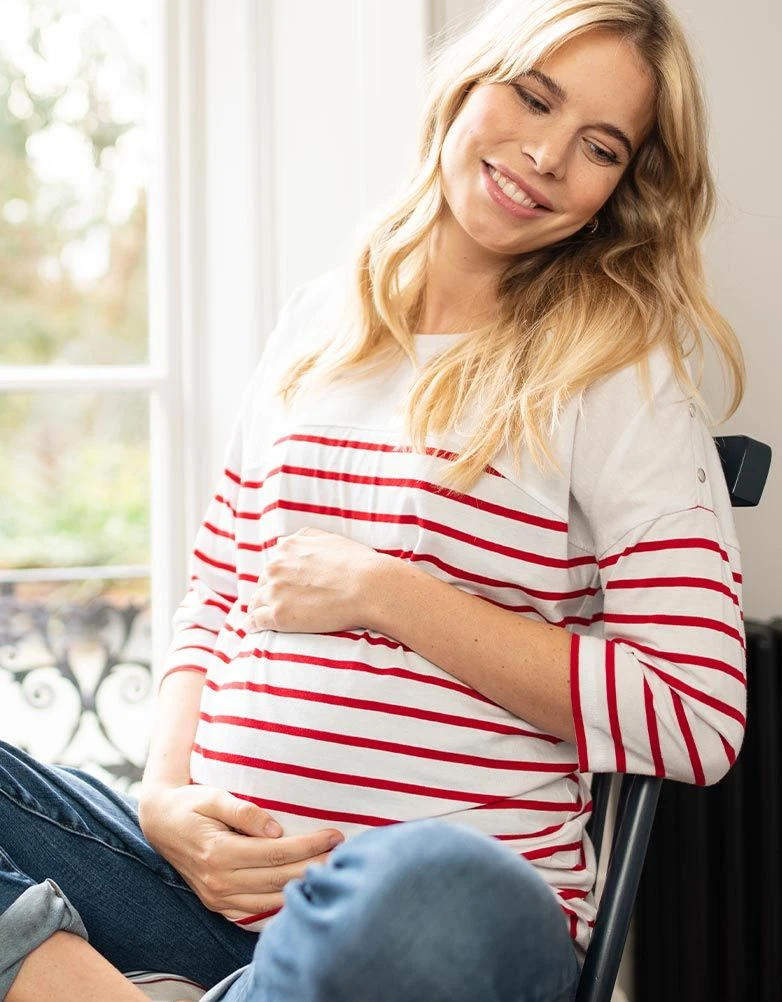 Notre haut de grossesse et allaitement rayé rouge est un essentiel. Doux et léger, en 100% coton, il est parfait pour les peaux sensibles. Sa coupe longue vous garantira un ajustement parfait tout au long de votre grossesse tandis que les boutons pression au niveau des épaules vous faciliteront l’allaitement. Associez ce t-shirt grossesse avec un jean déchiré et une paire de sandales pour un style décontracté et tendance.