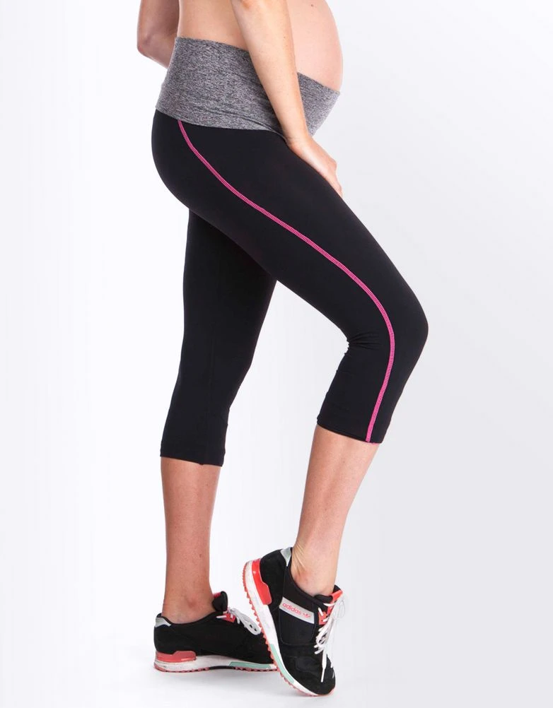 - Le legging de sport offre un bandeau au niveau de la taille ultra confortable qui pourra être porté sur ou en-dessous du ventre et replié une fois bébé né. Les jambes ¾ du legging présente des détails rose fluo en forme de spirale de derrière sur le devant pour un look dynamique et sportswear.