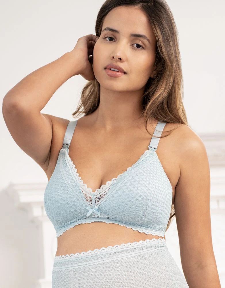 Designed by our expert team of mums, youâll love our Light Blue Lace Maternity & Nursing Bra. Ultra-feminine with delicate lace detailing, this beautiful bra offers a flexible fit with wide, adjustable straps and extra size settings at the back. Perfect for your changing curves through pregnancy & daily fluctuations while breastfeeding. The structured design offers fantastic support without the need for underwire, while the moulded cups ensure a smooth and flattering shape. Once baby arrives, easy-open clips drop the cups down for fuss-free feeds, while a soft cotton panel inside provides extra coverage while you nurse.