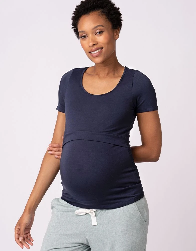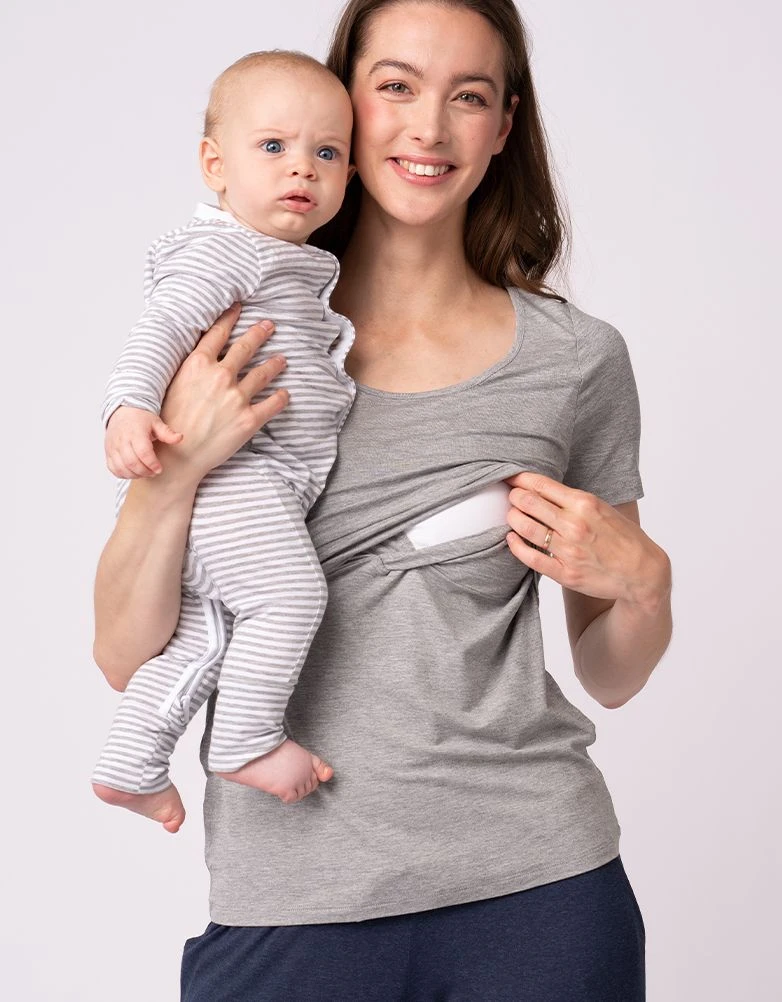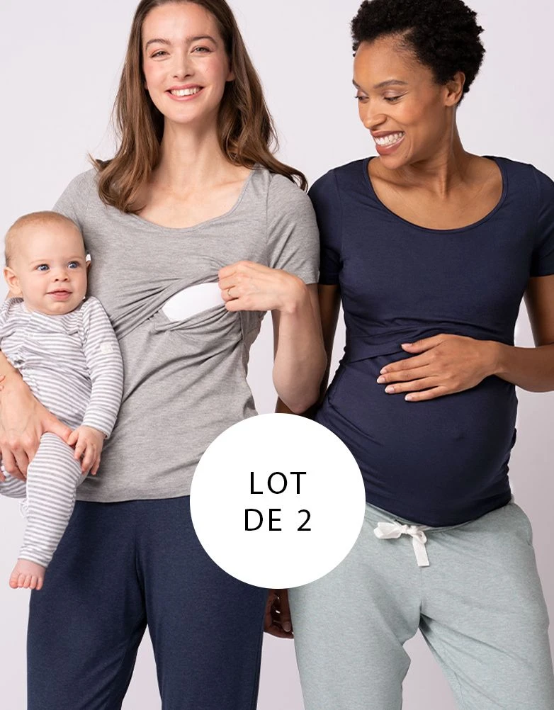 On a jamais assez de t-shirt dans son dressing, alors pourquoi ne pas craquer sur ce lot de 2 t-shirts de grossesse et allaitement gris et bleu marine. Conçus pour vous accompagner à chaque étape, il suffit de relever le haut pour allaiter une fois votre bébé né. Fabriqués dans une viscose en bambou douce, ils sont parfaits pour les peaux sensibles.