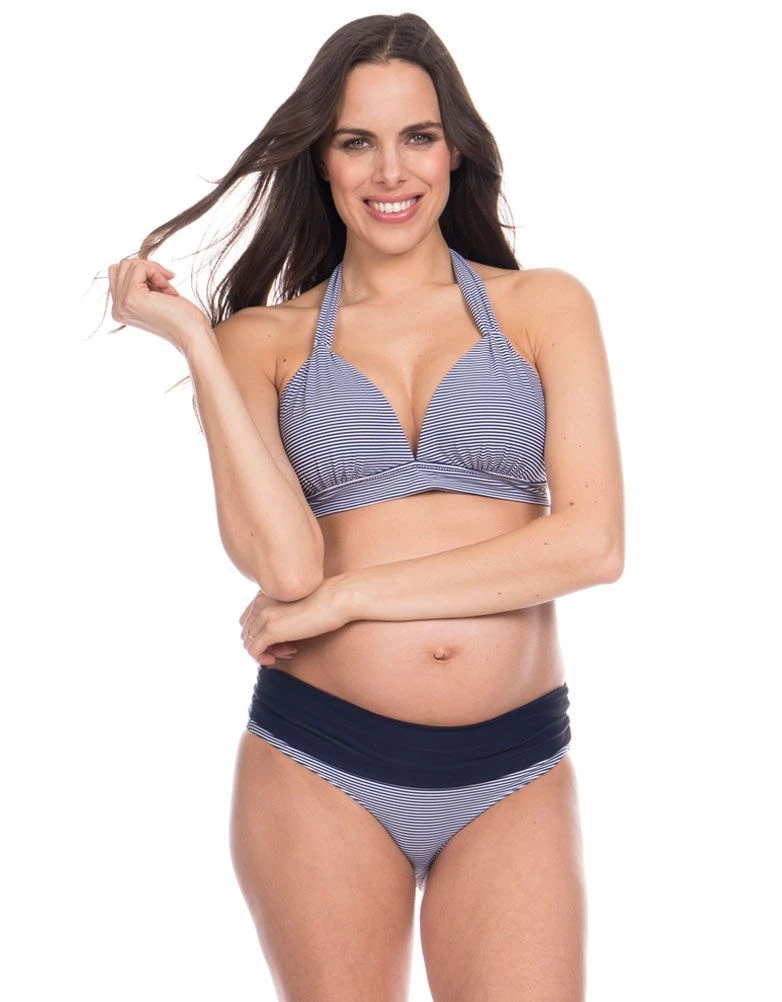 Osez les rayures sur la plage afin de sublimer vos nouvelles formes de femme enceinte. Ce maillot de bain grossesse deux pièces vous assura maintien tout au long de votre grossesse grâce à son haut de bikini ajustable à la nuque et au dos. Sa culotte dotée d’un bandeau peut se porter au-dessus ou au-dessous du ventre afin de vous garantir un confort et maintien maximal. Soyez sublime et optez pour ce sublime maillot de bain grossesse deux pièces pour cet été!