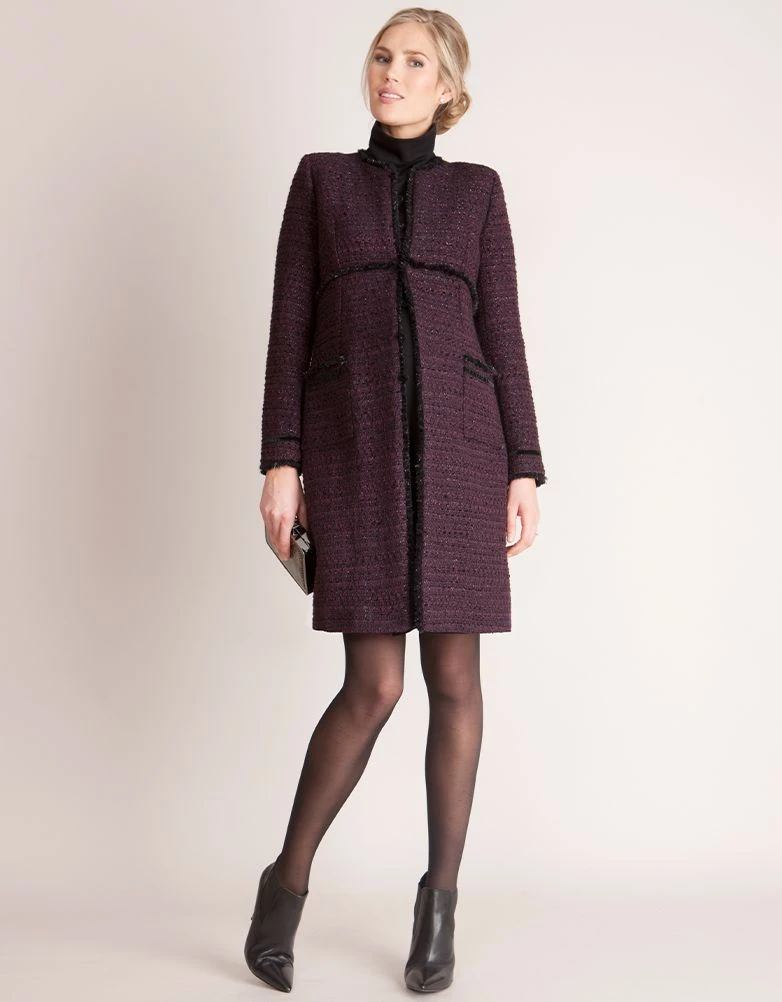 Conçu dans le studio londonien de Seraphine et porté par Kate Middleton, le manteau de maternité MARINA est fait dans un luxueux tweed de laine bouclé. Les fils d’argent subtiles ajoutent une touche d’éclat à la riche couleur pourpre, ce qui en fait le choix idéal pour un style élégant avant, pendant et après la grossesse. La silhouette longue ligne est accentuée avec une texture délicatement effilochée et se termine avec un ruban de velours noir. Sa longueur est juste au-dessus du genou et sa coupe souligne la taille empire. Associez-le à une jolie robe de maternité pour un look chic et élégant.