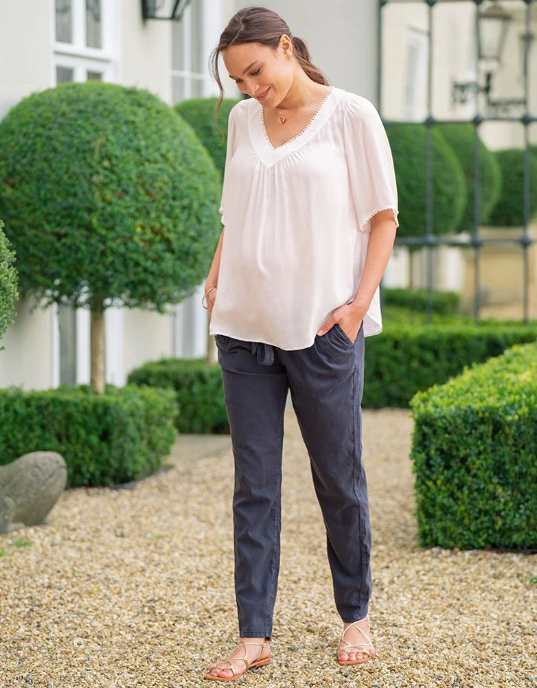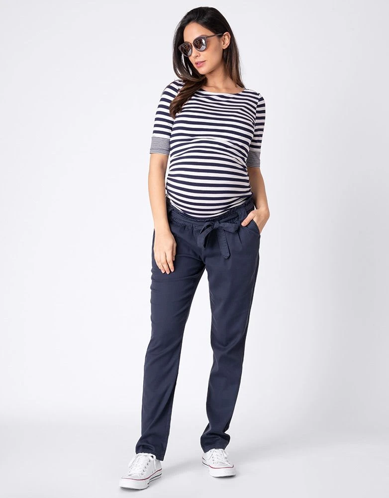 Très décontracté, notre chino de grossesse bleu marine est idéal pour le travail ou pour le week-end. Mélangeant du Tencel écologique et du coton doux et stretch, ce pantalon se porte facilement, offrant une coupe droite et décontractée. Sa taille élastiquée confortable assure un ajustement souple, tandis qu’une ceinture à nouer intelligente complète le look.