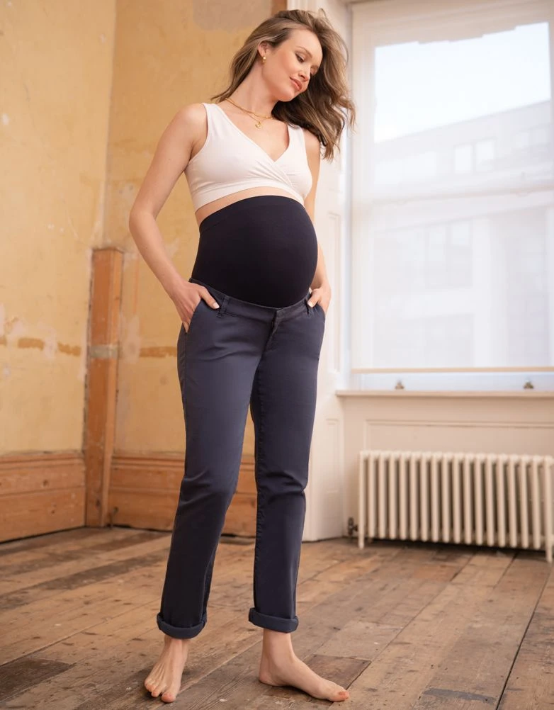 Ce pantalon de grossesse chino bleu marine sera l’addition parfaite à votre garde-robe de femme enceinte. Réalisé dans un coton ultra doux, ce pantalon femme enceinte vous offrira une silhouette élégante autant en retroussant le bas de pantalon qu’en le laissant long. Son bandeau taille haute vous garantira maintien et confort durant toute votre grossesse. Associez-le avec une chemise pour aller travailler ou un top et des baskets pour un style plus décontracté.