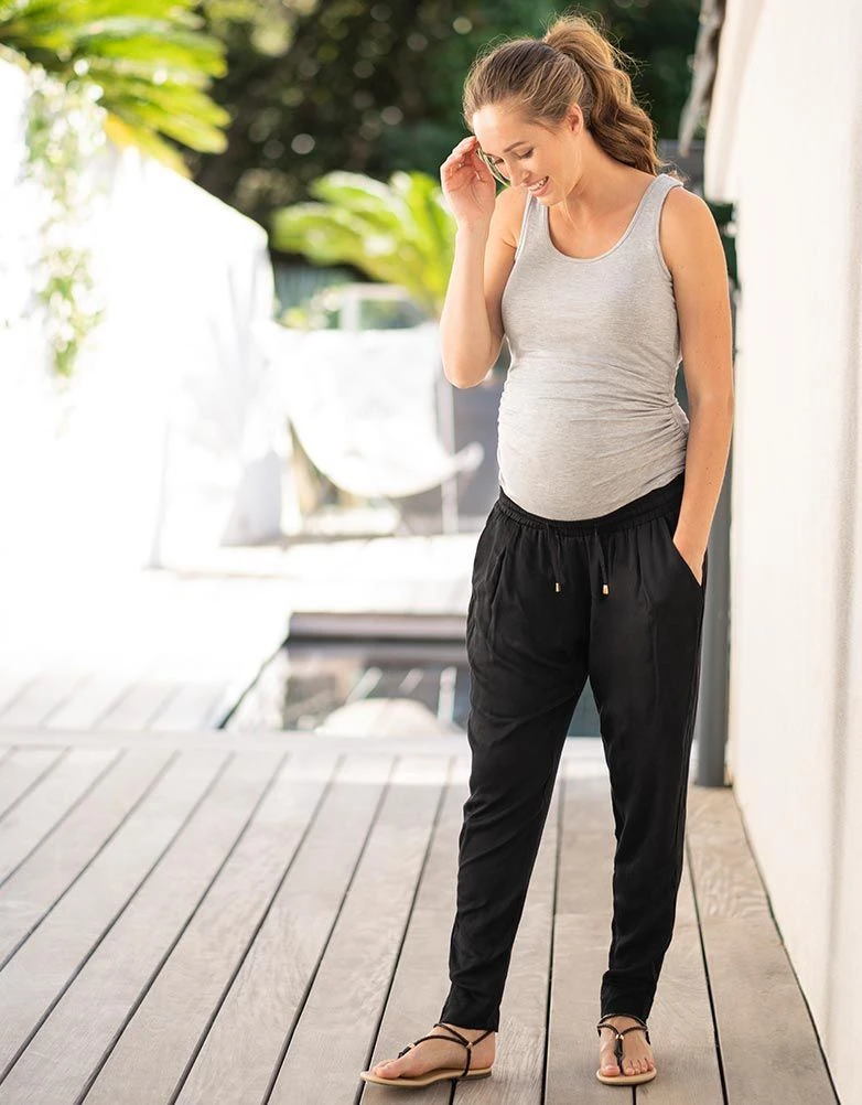Cool, confortable et ultra-facile à porter, ce pantalon sarouel de grossesse noir est un incontournable de l’été. Fabriqué en viscose tissée douce et coupé pour un ajustement facile, il est léger et respirant. Des poches et des détails sur les côtés complètent le look – parfait pour un style d’été facile.