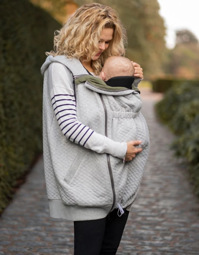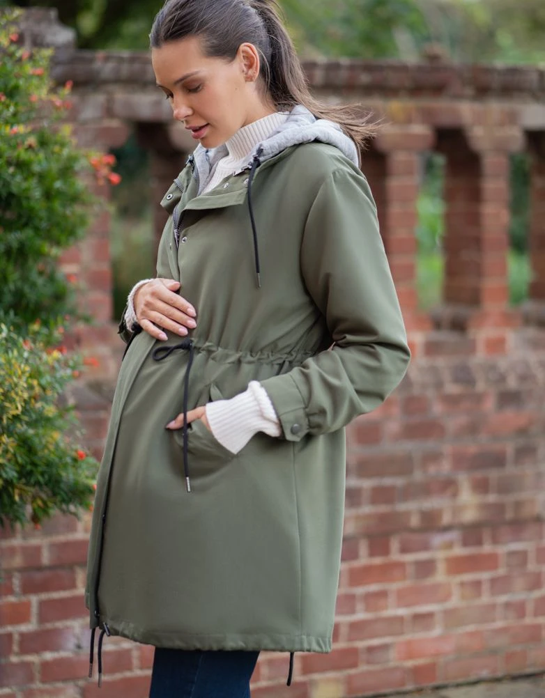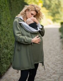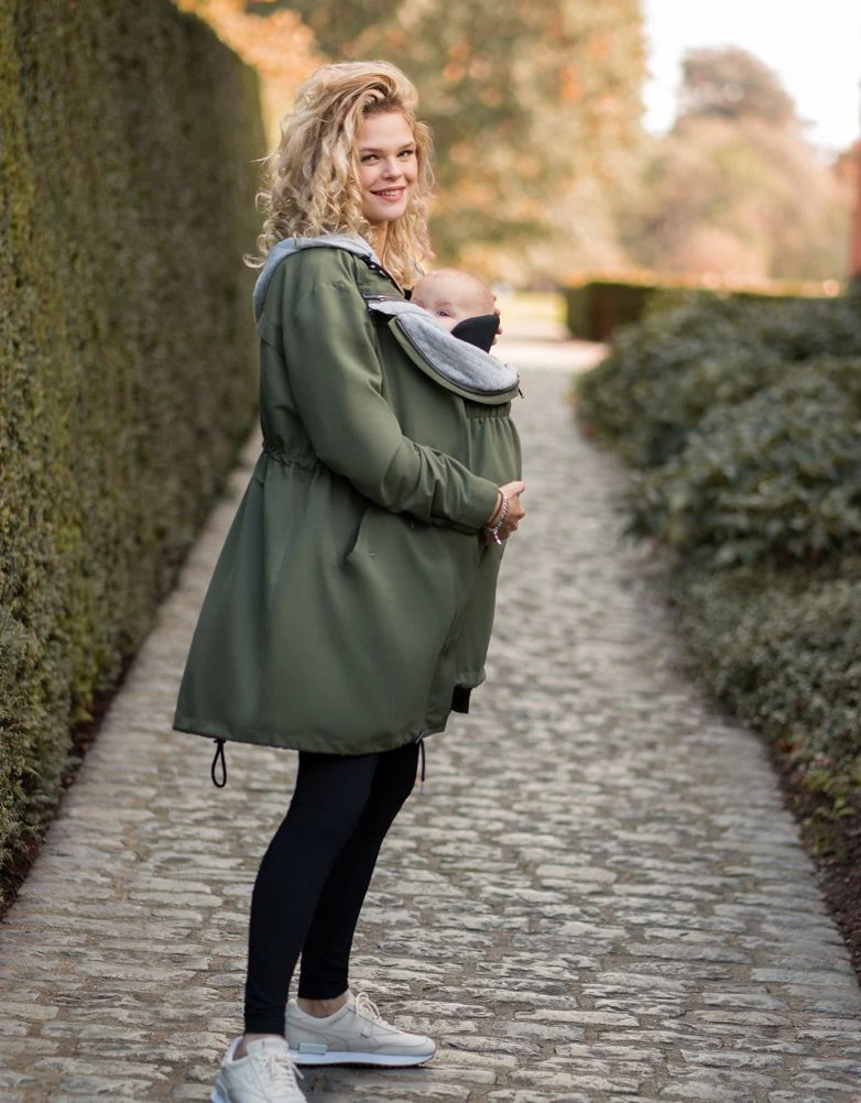 Nous sommes heureuses de vous présenter notre manteau léger 6 en 1 de grossesse et de portage kaki, idéal pour les mamans actives à la vie bien remplie. Conçu pour être porté de 6 façons différentes, ce modèle ultra-chic se compose de 3 pièces : un manteau à la mode, résistant à l’eau ; une veste à capuche sans manches amovible, en jersey matelassé ultra-doux, fixée par fermetures éclair ; et une poche kangourou amovible, entièrement réversible, à porter sur votre porte-bébé grâce à ses fermetures éclair.