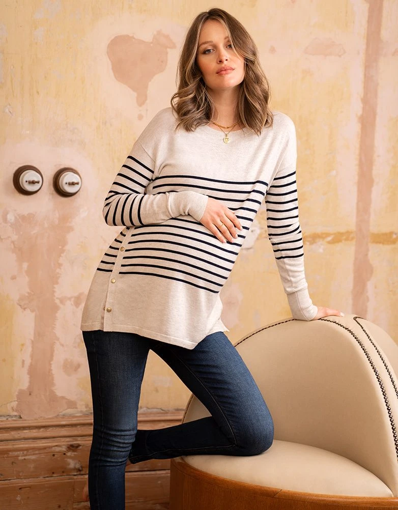 Apportez une touche bretonne à votre garde-robe de maternité avec notre pull d’allaitement à rayures beiges et bleues. Fabriqué dans un mélange de modal/coton et de stretch, ce pull est à la pointe de la mode et sublime vos nouvelles courbes avant, pendant et après votre grossesse. Une fois bébé né, les pressions sur le côté permettront d’allaiter en toute simplicité. Portez-le avec un jean slim, des bottines et une touche de rouge à lèvre pour une élégance quotidienne.