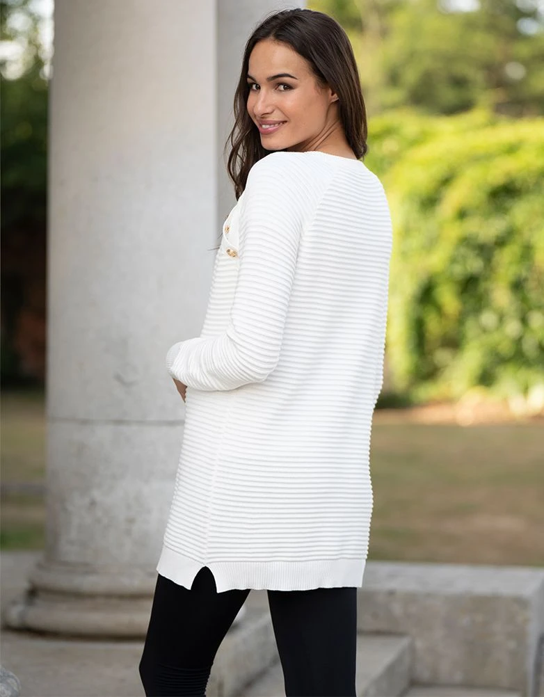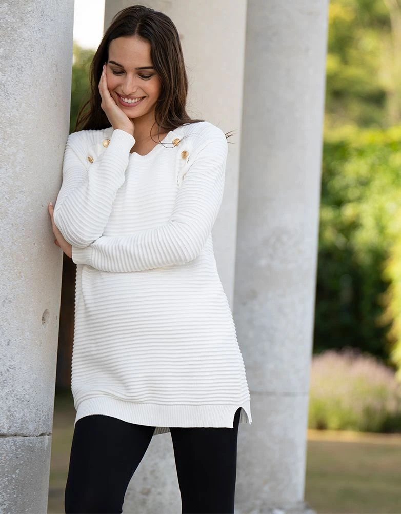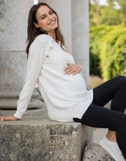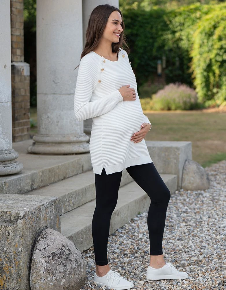 Nous adorons les tricots ultra-doux et élégants, comme notre pull à côtes en coton grossesse et allaitement couleur crème. Ces larges mailles côtelées 100 % coton sont parfaites pour les peaux sensibles, et hyper extensibles tout au long de la grossesse. Après la naissance de bébé, les boutons-pression faciles à ouvrir situés à l’avant permettent un allaitement rapide. Encore plus pratique, une pièce de tissu supplémentaire pour nourrir bébé en toute discrétion. Des boutons dorés élégants complètent ce look, qui s’assortit parfaitement avec un jean ou un legging.