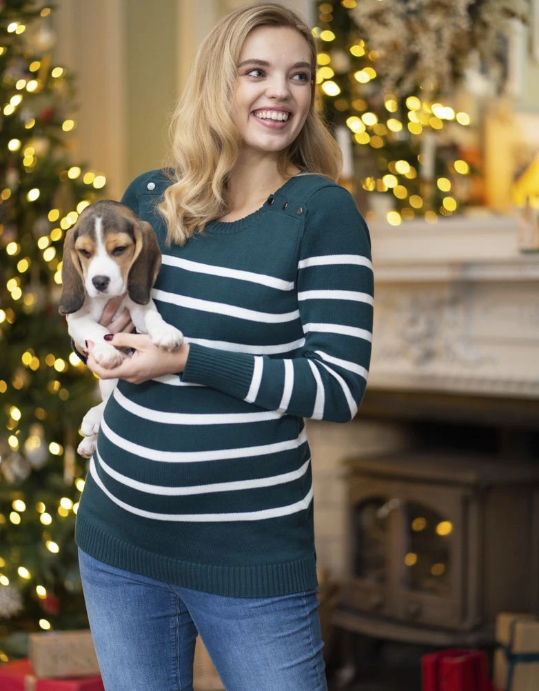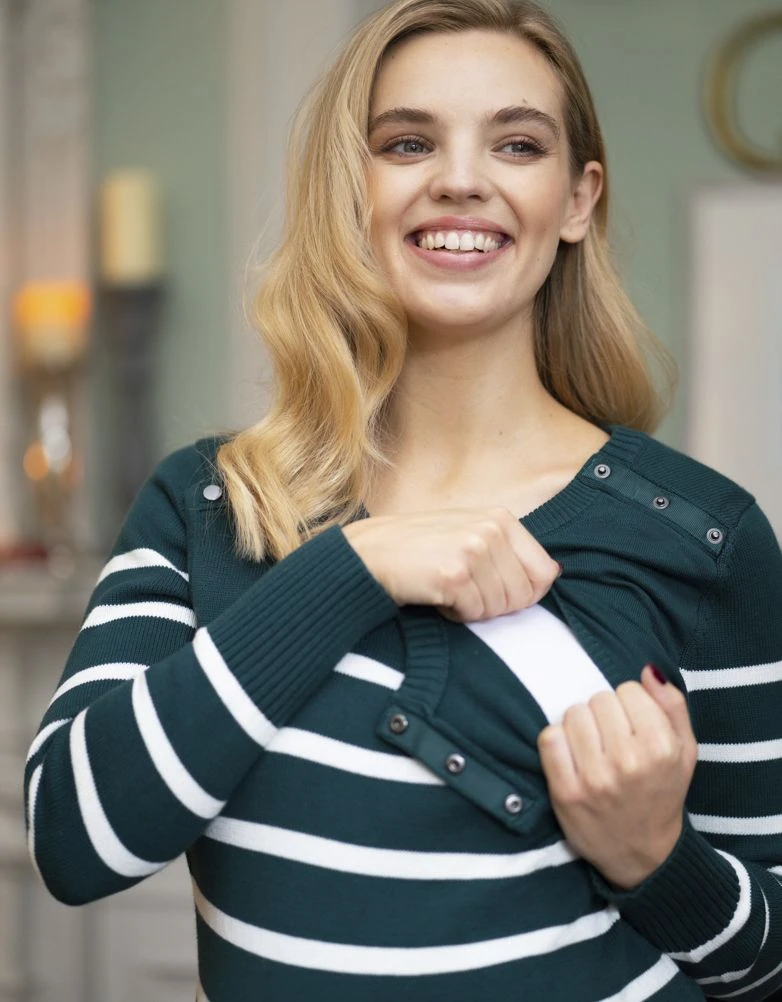 Beau et confortable, notre pull de grossesse et d’allaitement en coton vert à rayures est conçu pour durer bien au-delà de vos 9 mois. En 100% coton, il est parfait pour les peaux les plus sensibles et offre beaucoup de stretch pour vous accompagner à chaque étape. Après la naissance de bébé, des boutons-pression s’ouvrent facilement aux épaules pour un accès rapide à l’allaitement et un voile de discrétion intégré vous couvre quand vous allaitez. Portez-le avec un jean ou un legging pour un look casual que vous aimerez pendant des années !