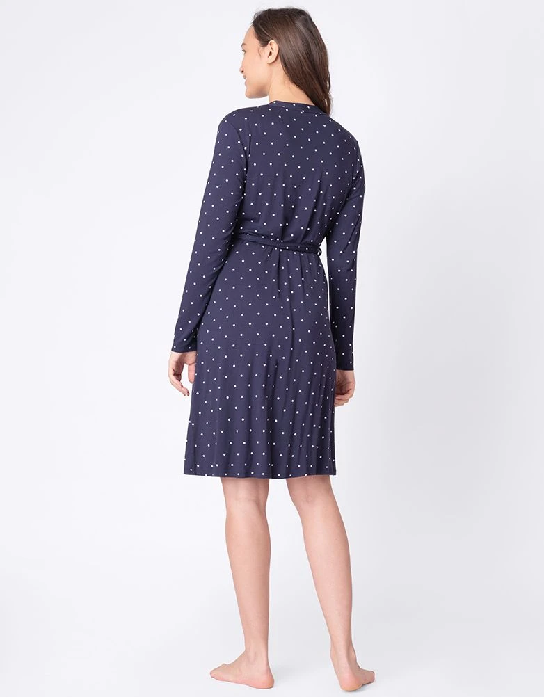 Optimisez votre routine du soir avec notre pyjama 2 pièces de grossesse et d’allaitement à pois bleu marine. D’une douceur extrême et facile à porter, la nuisette offre une coupe flexible qui vous suit tout au long de la grossesse, puis des clips faciles à ouvrir vous permettent d’allaiter aisément après la naissance de bébé. La robe de chambre assortie est la pièce de superposition parfaite, idéale à mettre dans votre sac d’hôpital et pour les matinées farniente à la maison avec bébé.
