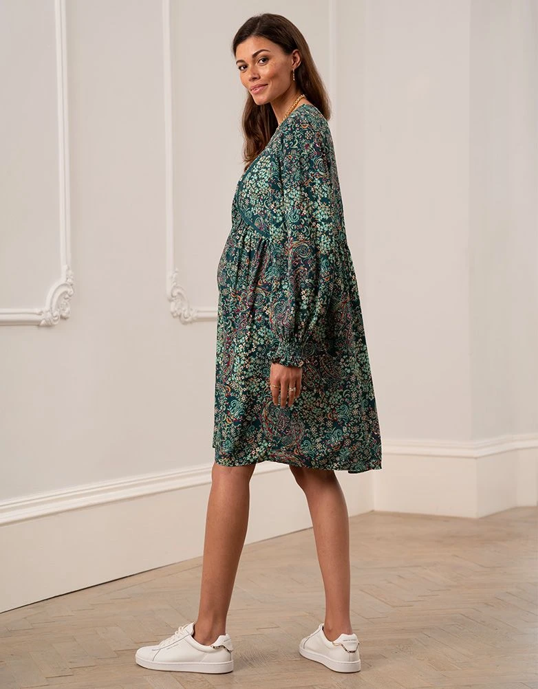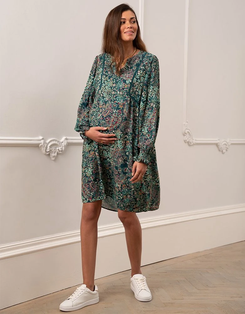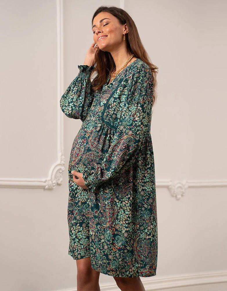 Notre robe blouse grossesse et allaitement à imprimé cachemire adopte un style bohème romantique et une coupe fluide et ample. C’est une pièce indispensable pour les jeunes mamans. Confectionnée en viscose tissée toute douce, elle drape magnifiquement vos courbes et s’ajuste à votre ventre qui s’arrondit, tandis qu’une ceinture à nouer au dos définit votre silhouette à tous les stades de la maternité. Après la naissance de votre bébé, de discrètes fermetures éclair s’ouvrent sur le devant pour allaiter ou tirer votre lait en toute simplicité. Un imprimé cachemire chic et des bordures contrastées complètent le look, parfait avec des sandales au printemps ou des collants et des bottines par temps froid.