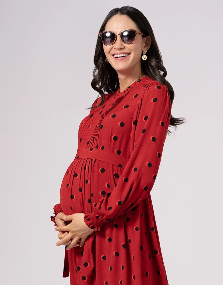 Aussi charmante qu’astucieuse, notre robe blouse grossesse et allaitement rouge à pois est la preuve, s’il en était besoin, que les vêtements de maternité n’ont pas vocation à être basiques ! Confectionné en viscose tissée toute douce, ce modèle offre beaucoup d’espace à votre ventre qui s’arrondit et drape magnifiquement votre silhouette grâce à une coupe empire seyante, même après la naissance de bébé. La ceinture à nouer peut être resserrée pour souligner votre taille, tandis que les poignets froncés et de jolis plis complètent cette séduisante robe de maternité rouge. Comme si tout cela ne suffisait pas, des fermetures éclair savamment dissimulées vous permettent d’allaiter et de tirer votre lait où que vous soyez. Ainsi, vous pourrez porter ce modèle bien plus longtemps que pendant les neuf mois de la grossesse.