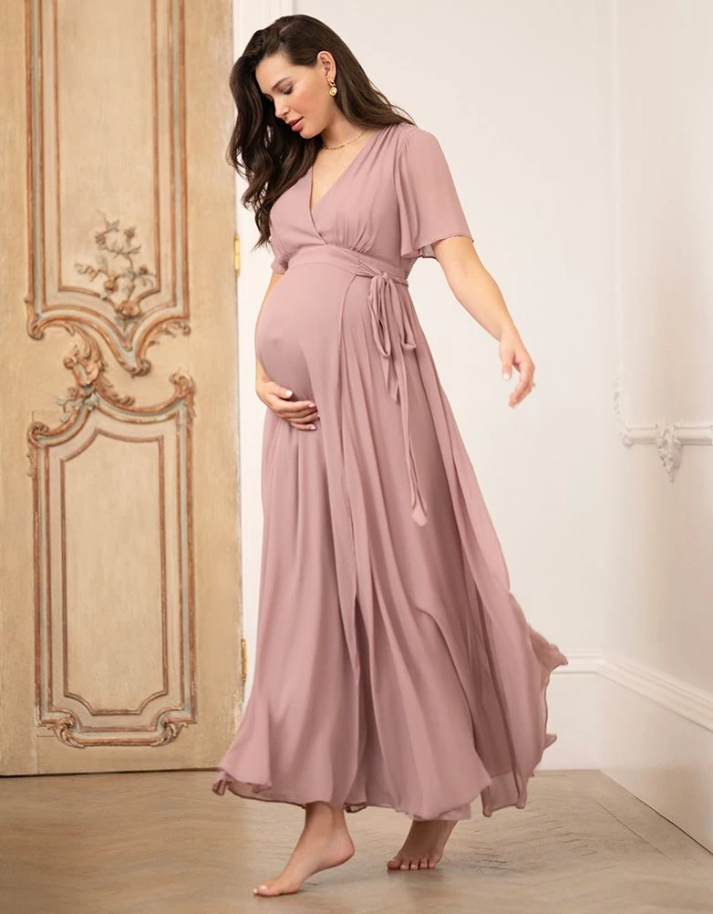 Douce, flatteuse et entièrement féminine, notre robe cache-cœur maxi mauve grossesse et allaitement est un style éblouissant pour les occasions spéciales. Le modèle cache-cœur classique en georgette de viscose fluide se drape magnifiquement sur votre ventre en pleine croissance, vous permettant de régler la coupe au fur et à mesure que vous grandissez, tandis que la taille élastiquée à l’arrière assure une coupe confortable et soupe. Une doublure fixe non enveloppante dans une teinte assortie de jersey extensible et doux permet de maintenir le modèle en place, même par temps venteux. Lorsque bébé arrive, le cache-cœur s’ouvre pour révéler une couche cachée, facile d’accès pour l’allaitement. Des manches féminines à volants complètent le look – nous adorons ce modèle pour les mariages, les occasions estivales et les séances photos de grossesse !
