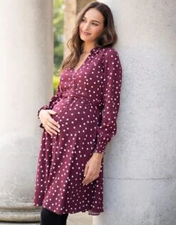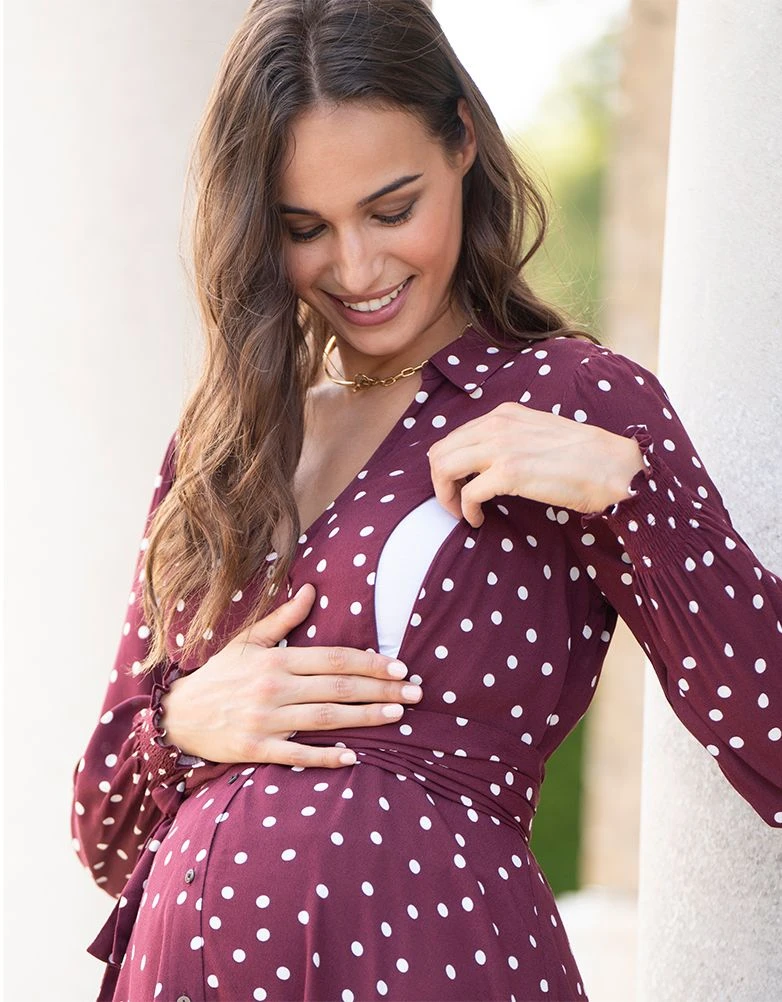 Spécialement conçue pour les mamans, notre robe de grossesse et d’allaitement bordeaux à pois n’est pas seulement flatteuse, elle est aussi très pratique ! Confectionnée en viscose tissée toute douce, la jupe trapèze drape magnifiquement votre ventre qui s’arrondit, tandis qu’une ceinture à nouer amovible souligne joliment la poitrine. Des fermetures éclair discrètes ont été ajoutées pour permettre d’allaiter ou de tirer son lait en toute simplicité, une fois bébé arrivé. Elles sont si bien cachées que vous porterez cette robe pendant des années, sans que personne ne devine sa fonction ! Le style est complété par des manches longues avec poignets froncés féminins. À porter avec des collants et des bottes pendant l’hiver, ou jambes nues avec des baskets pendant les mois les plus chauds.
