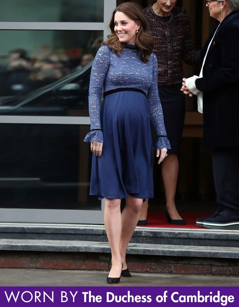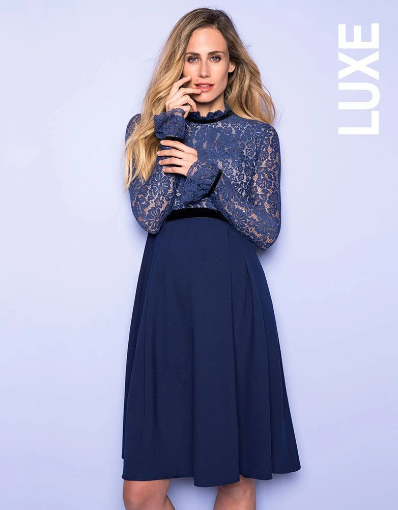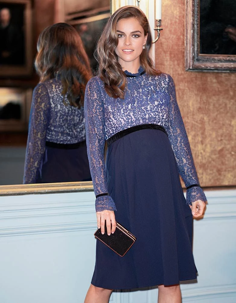 Portée par Kate Middleton, notre robe de cocktail grossesse avec bustier en dentelle Marlene est une pièce unique, pour toutes vos occasions spéciales. La jupe en soie fluide drape parfaitement vos nouvelles courbes, créant une coupe évasée qui sublime la silhouette avant, pendant et après la grossesse. Le magnifique bustier en dentelle est entièrement doublé en jersey stretch, tandis que les élégantes manches longues volantées et les details en velour noir complètent le look.