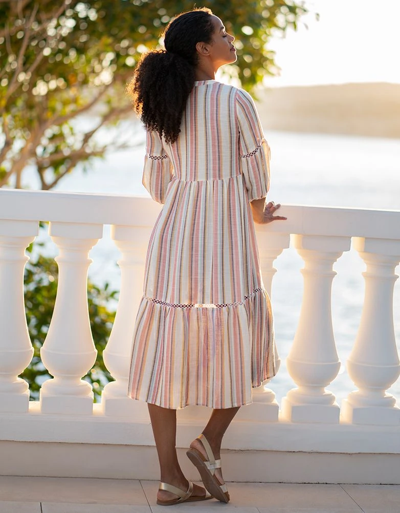 Seraphine Robe De Grossesse à Allaitement Mi-longue à Rayures Vintage Et Bordée De Dentelle