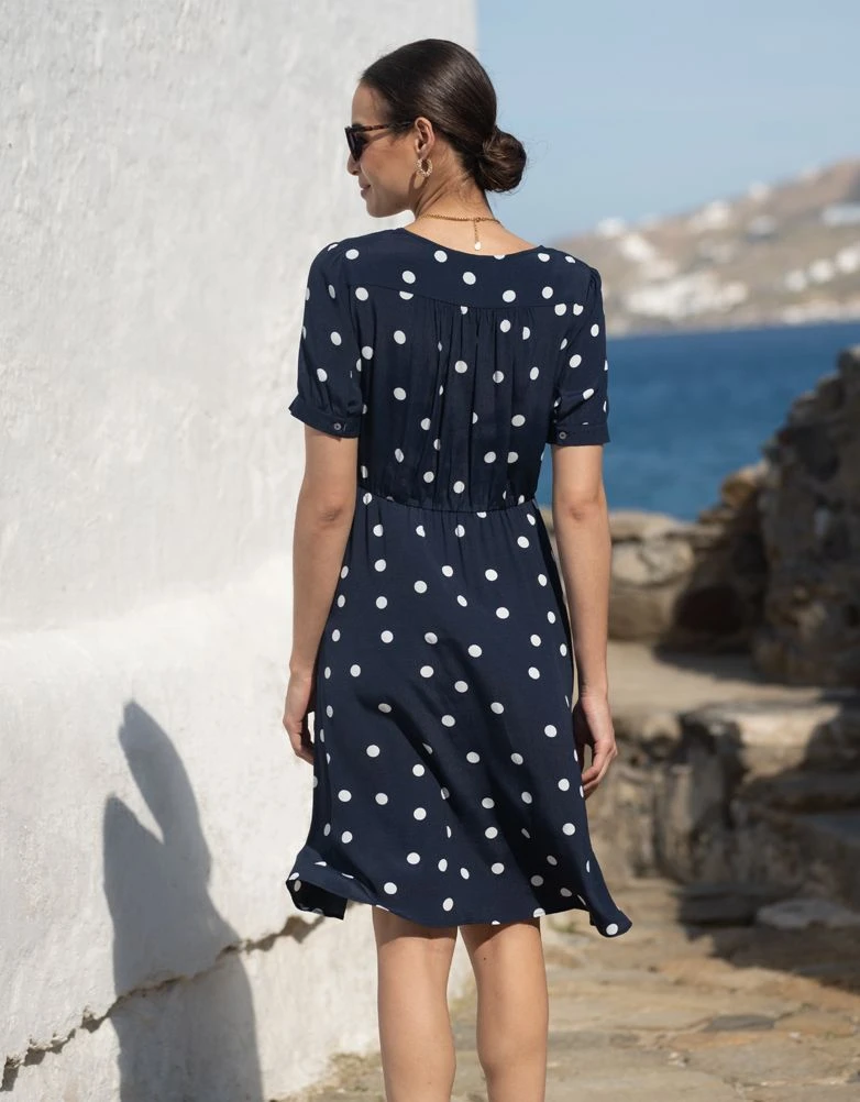 Seraphine Robe De Grossesse Et D’allaitement à Pois Bleu Marine Et Blanc Nouée Sur Le Devant