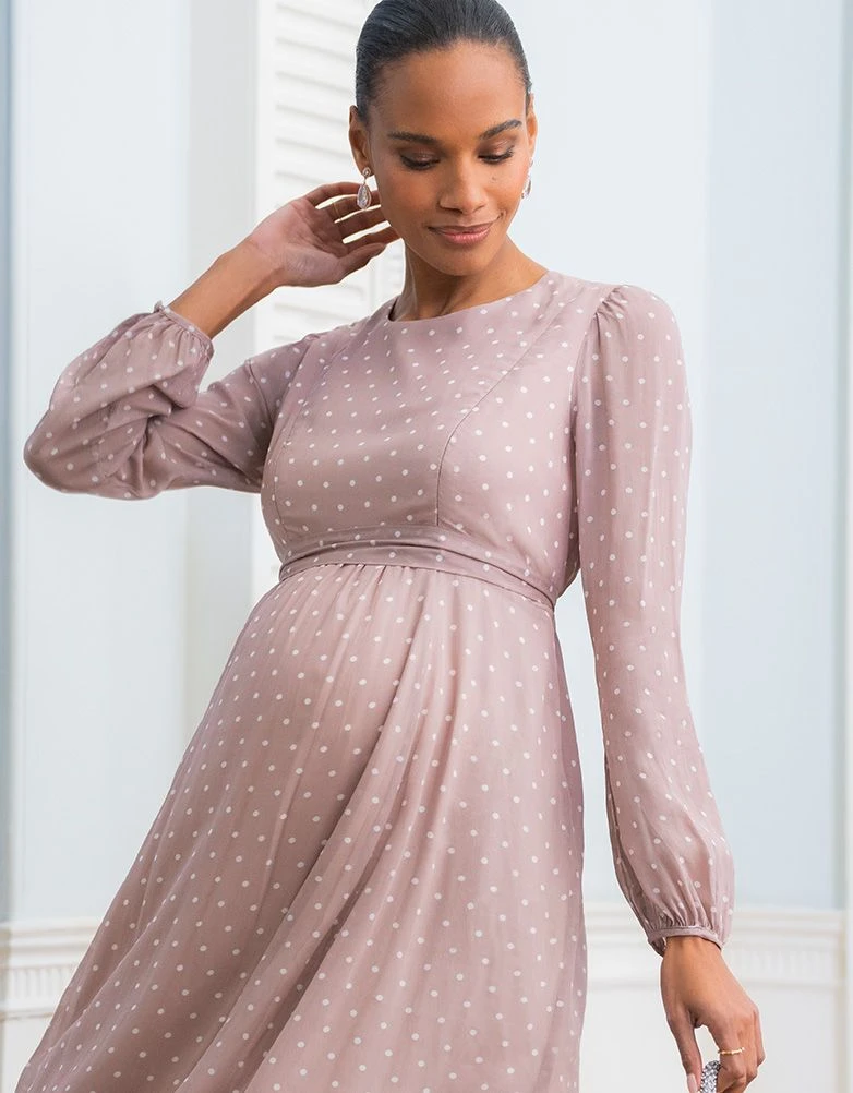 Seraphine Robe De Grossesse Et D’allaitement En Mousseline à Pois Taupe Et Blanc
