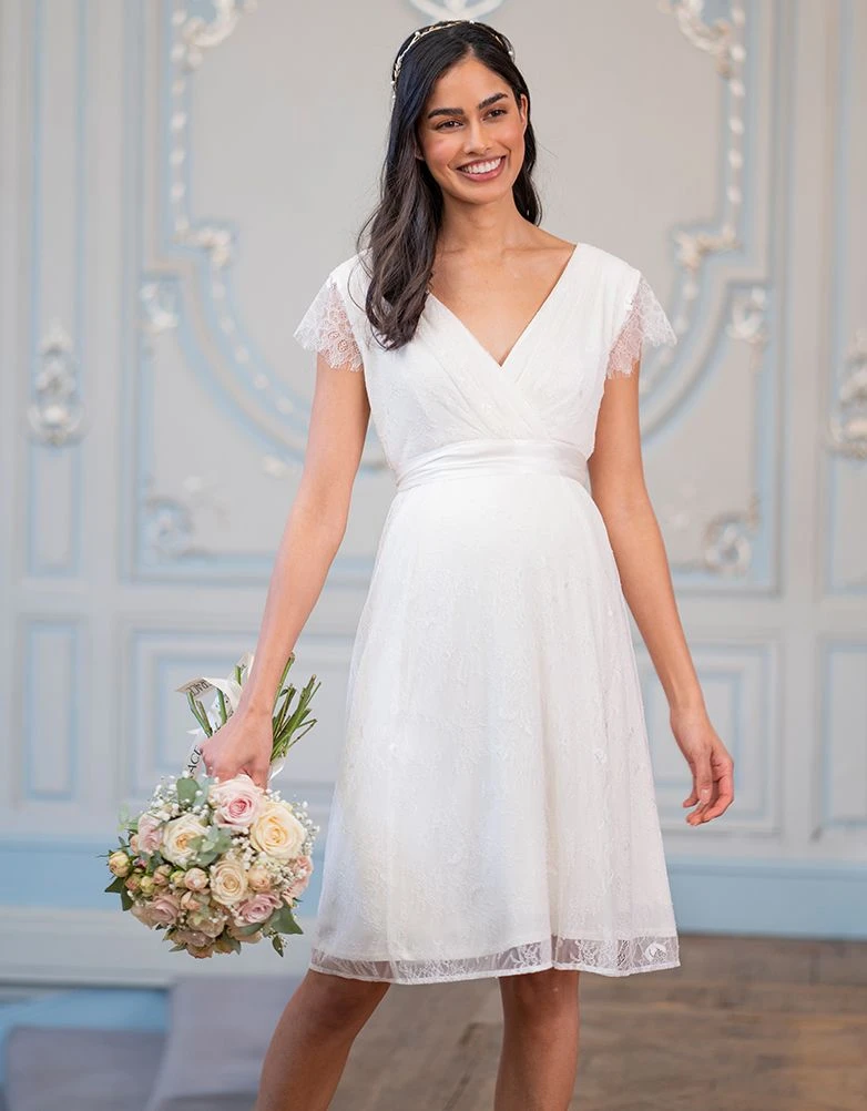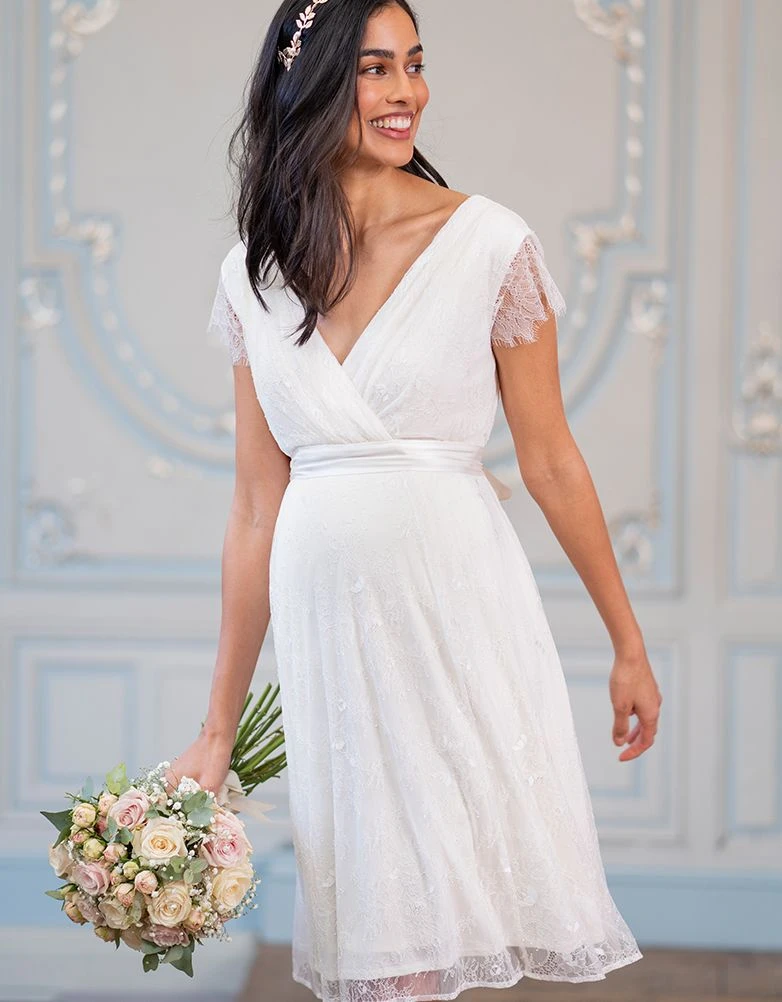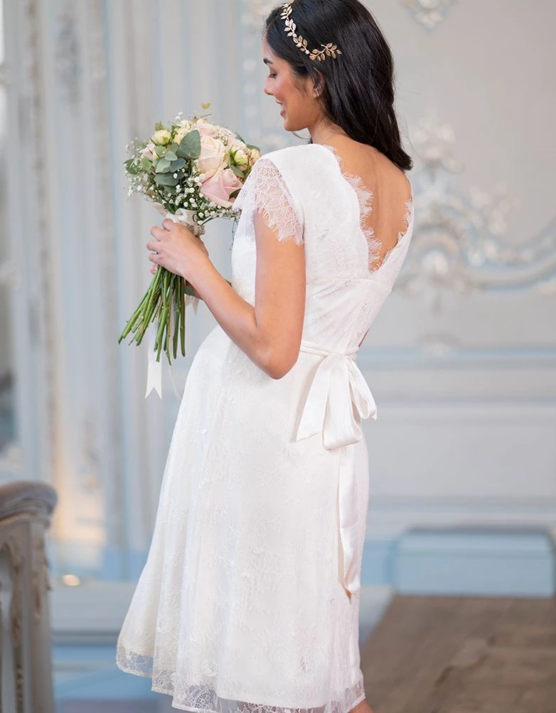 Faites tourner les têtes le jour de votre mariage avec notre robe de mariée grossesse courte en dentelle. Entièrement doublée, elle tombera parfaitement sur vos courbes de future maman offrant un ajustement parfait à chaque étape de votre grossesse. Son décolleté dans le dos apporte une touche ultra glamour à cette superbe robe de mariée de maternité. La ceinture amovible vous permettra de structurée votre silhouette et de mettre en valeur votre ligne empire. La dentelle sur les épaules et le décolleté en V sublimeront merveilleusement votre poitrine pour un rendu très élégant.