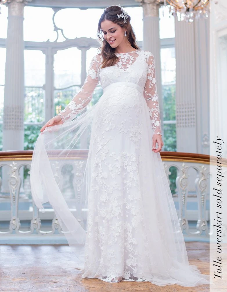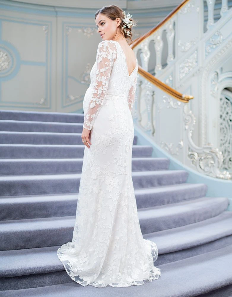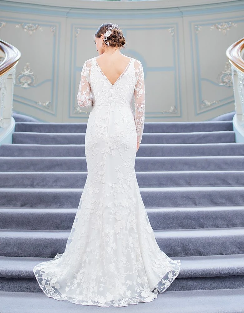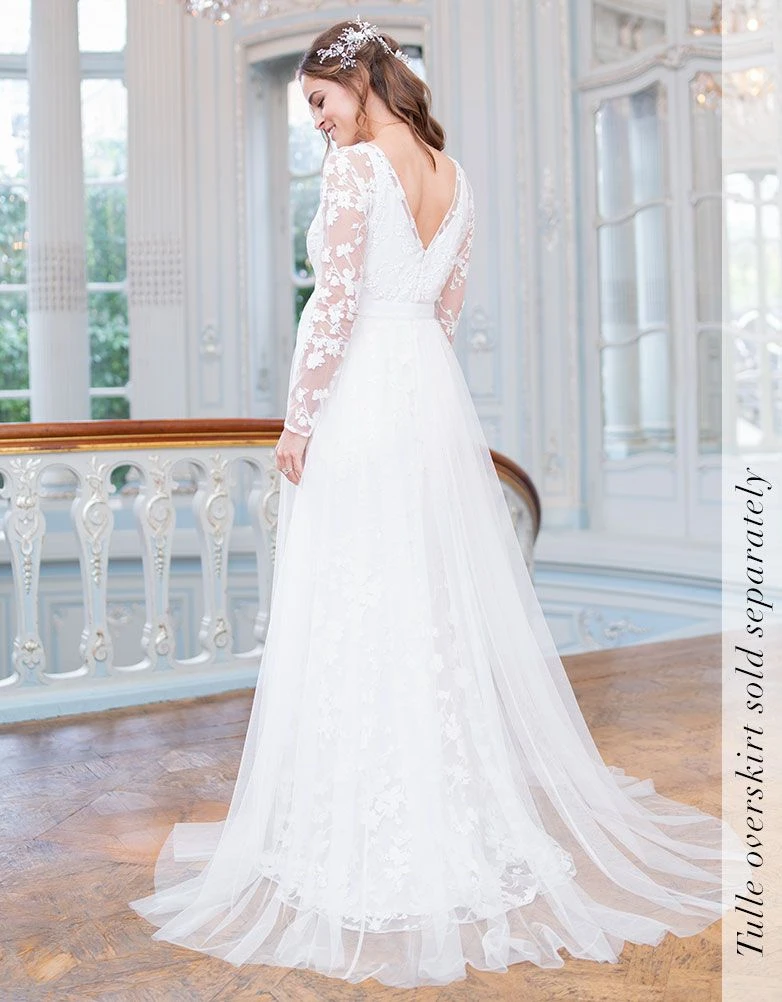 li>Traîne nuptiale avec boucle et bouton à l’arrière pour l’épingler en cas de besoin