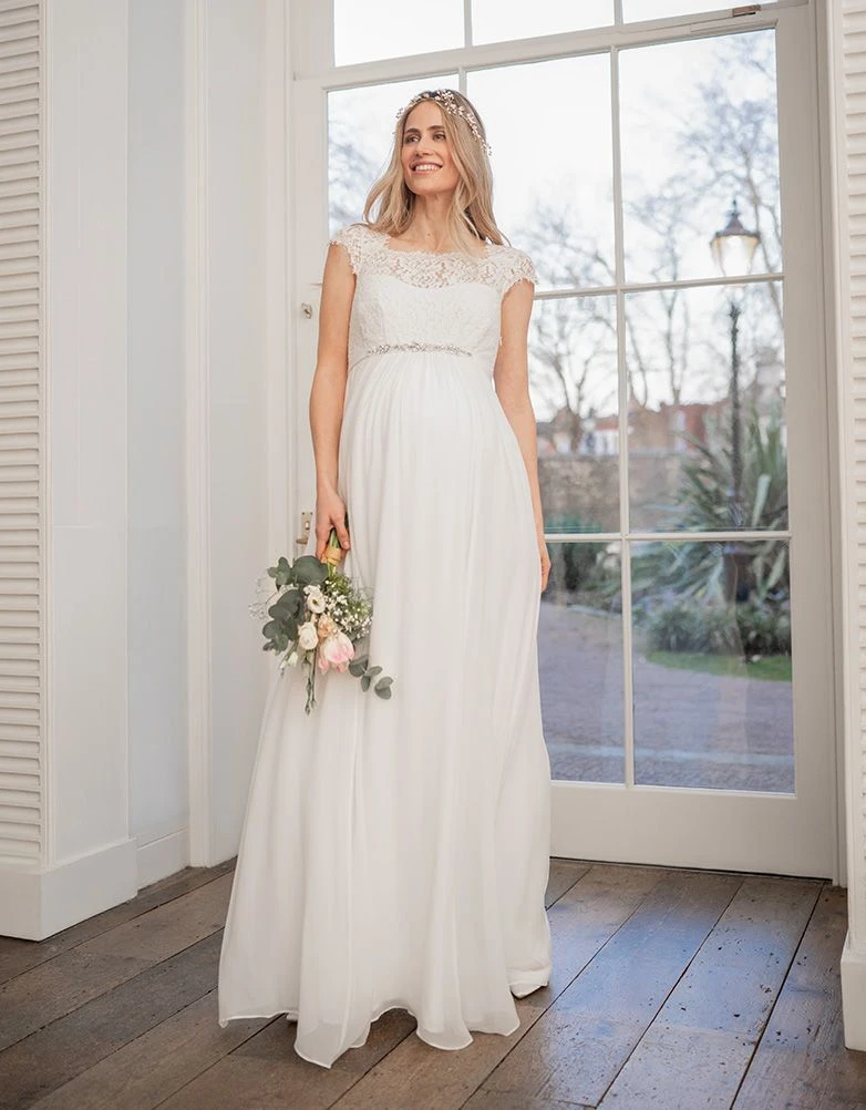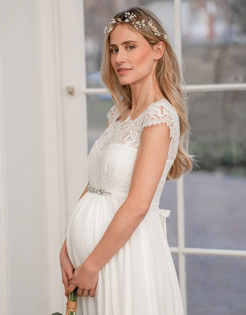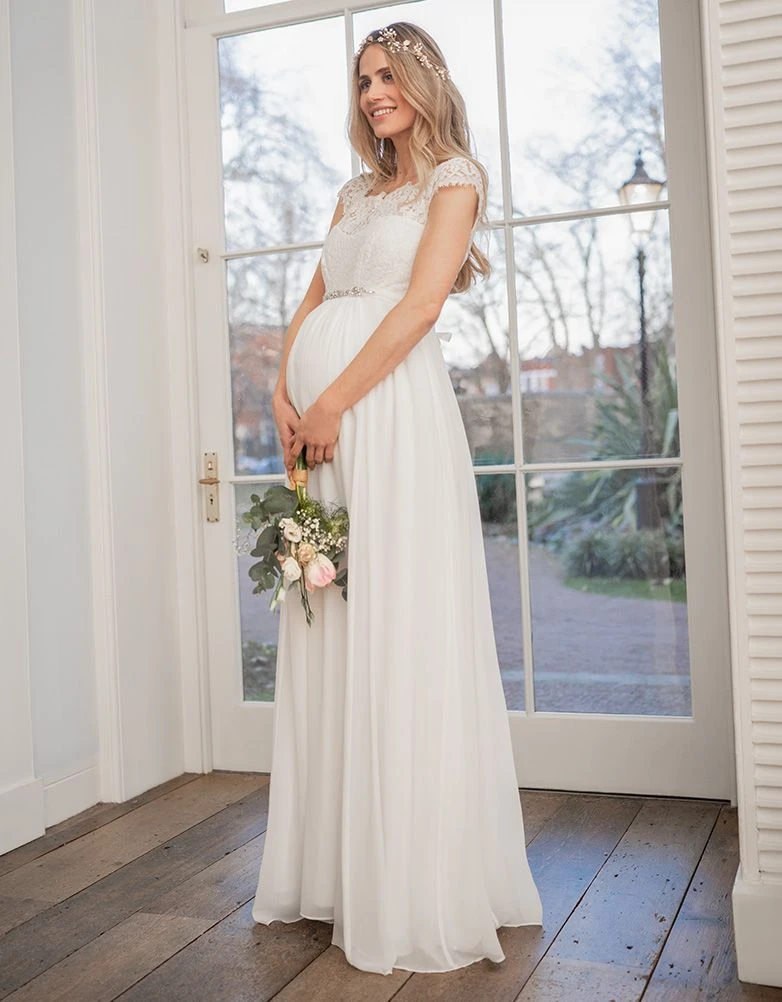 Réalisée pour les occasions spéciales, la robe de mariée grossesse en soie et dentelle couleur ivoire est un très beau choix pour le grand jour. Entièrement doublée, la jupe toute en soie drape joliment vos courbes de femme enceinte tandis que le haut de la robe tout en dentelle recouvre délicatement vos épaules. Une bande stretch au dos de la robe assure une taille flexible et ajustée, de même que la fermeture à zip sur le côté permet de l’enfiler facilement tout au long de votre grossesse. Une jolie ceinture bijou finit la robe et vous donne l’allure d’une déesse grecque.
