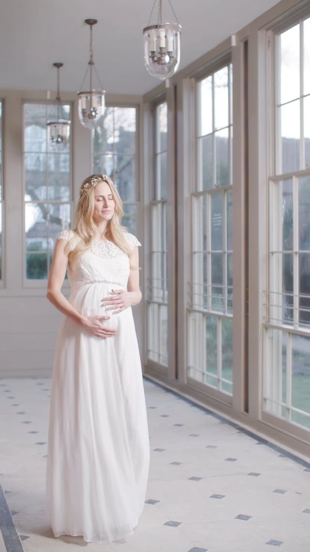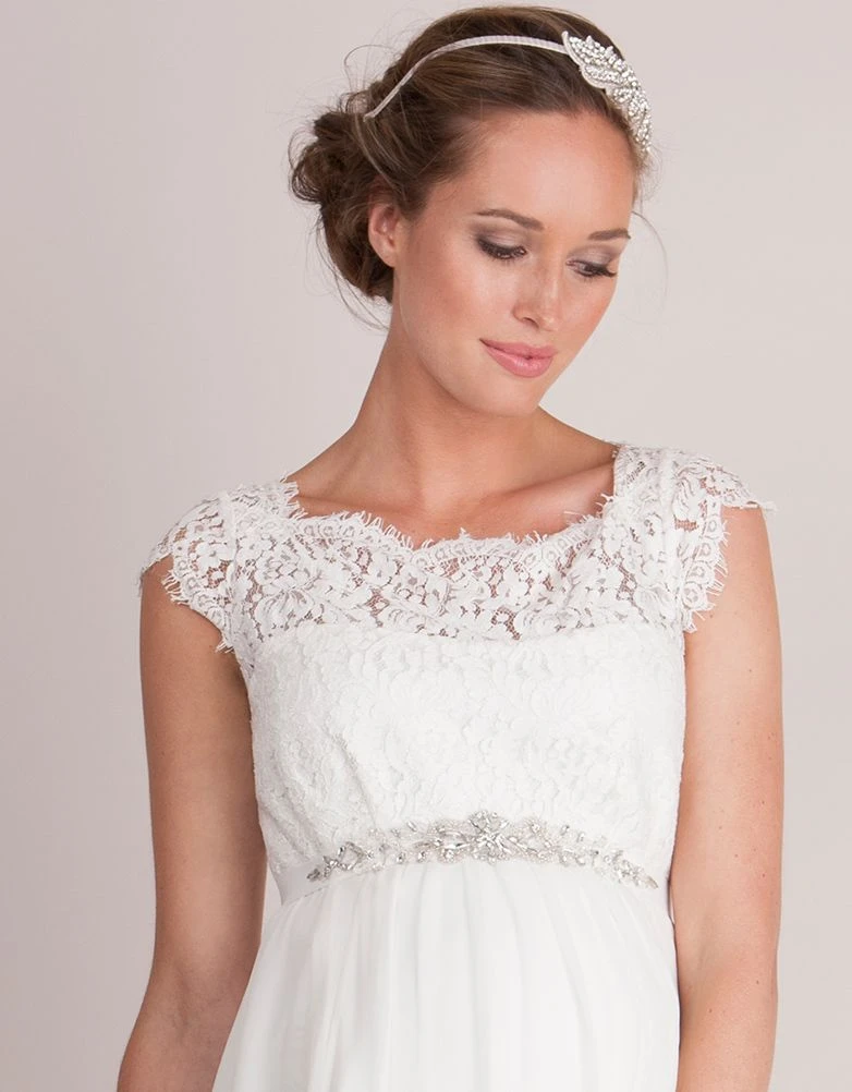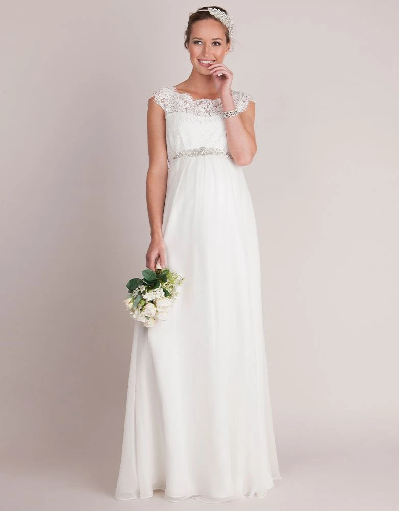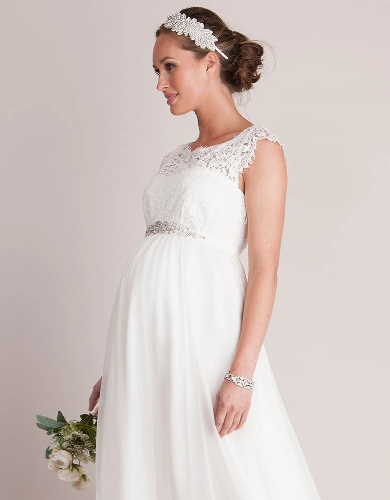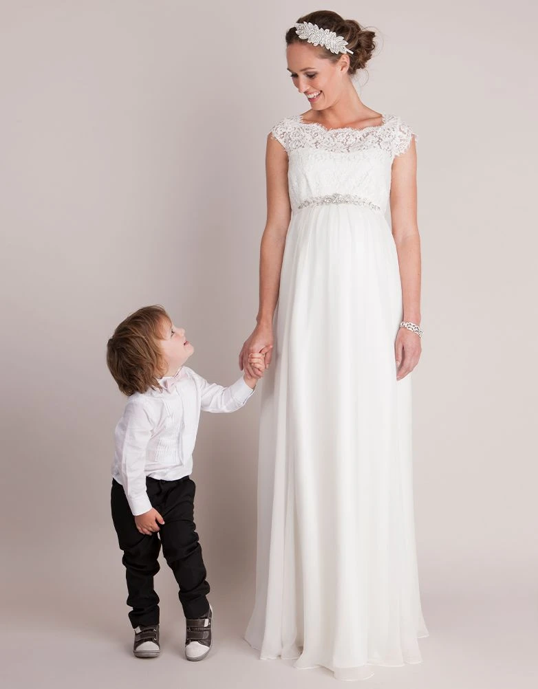 Réalisée pour les occasions spéciales, la robe de mariée grossesse en soie et dentelle couleur ivoire est un très beau choix pour le grand jour. Entièrement doublée, la jupe toute en soie drape joliment vos courbes de femme enceinte tandis que le haut de la robe tout en dentelle recouvre délicatement vos épaules. Une bande stretch au dos de la robe assure une taille flexible et ajustée, de même que la fermeture à zip sur le côté permet de l’enfiler facilement tout au long de votre grossesse. Une jolie ceinture bijou finit la robe et vous donne l’allure d’une déesse grecque.