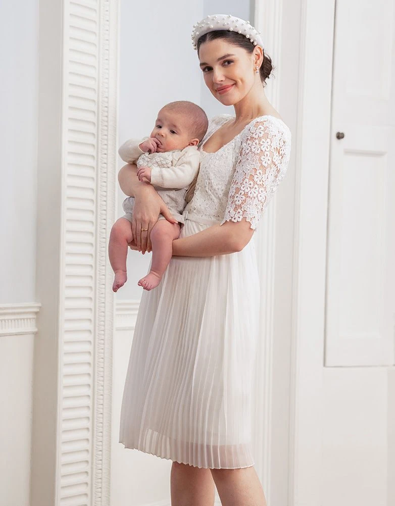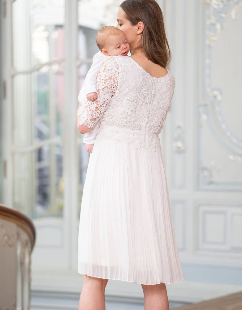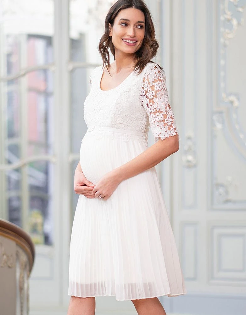 Notre élégante robe de mariée grossesse et allaitement ivoire à tout de la robe idéale ! Sa dentelle raffinée, sa coupe ainsi que ses accès pour allaiter feront de cette robe une addition parfaite à votre nouvelle garde-robe de future maman. La jupe dessinera avec finesse vos nouvelles formes de femme enceinte et le haut accentuera votre taille empire. Elle est le choix idéal pour une occasion spéciale lors de votre grossesse ou même après la naissance de bébé.