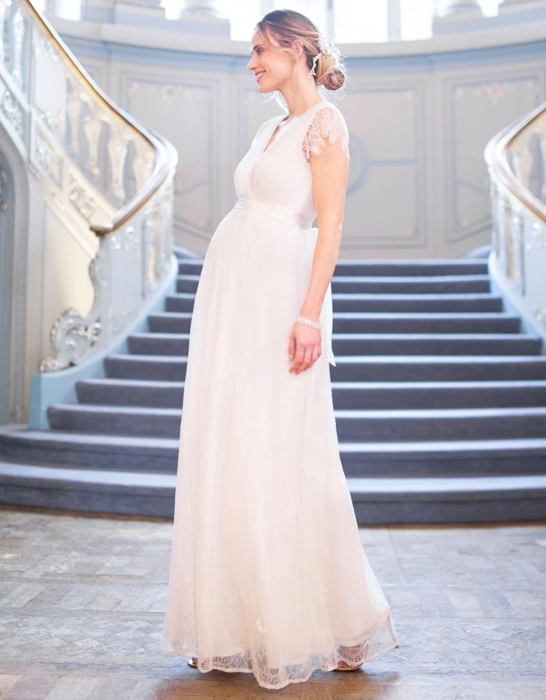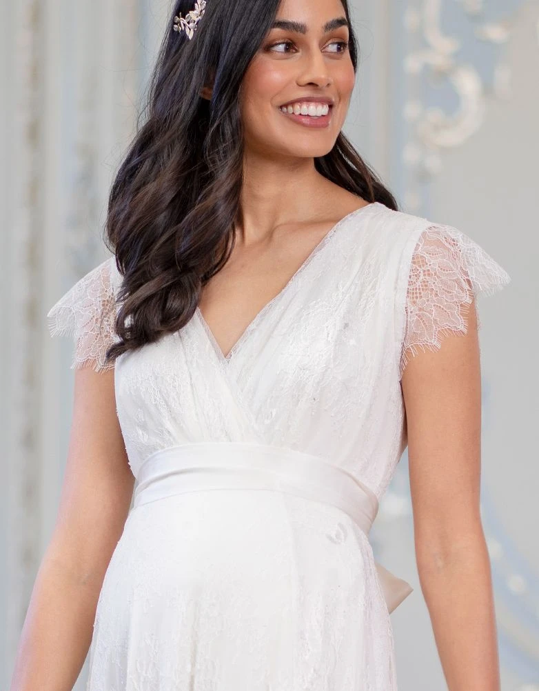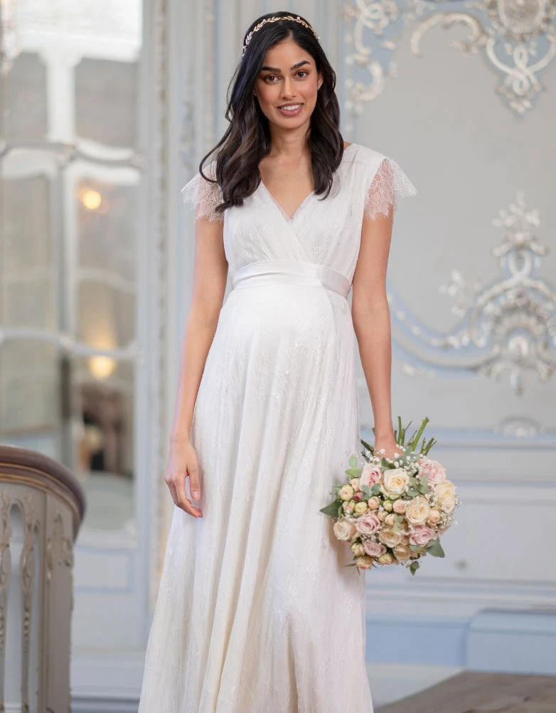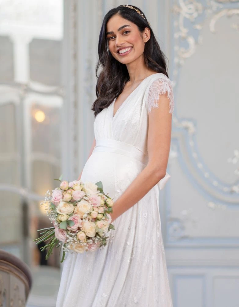 Soyez sublime pour le jour le plus important de votre vie avec notre superbe robe de mariée grossesse longue en dentelle française. Entièrement doublée, elle tombera parfaitement sur vos courbes de future maman offrant un ajustement parfait à chaque étape de votre grossesse. La ceinture amovible mettra magnifiquement en valeur votre ligne empire. Le décolleté en V dans le dos apporte une touche glamour à cette robe de mariée de maternité tandis que les manches en dentelle non doublée habilleront élégamment vos épaules.