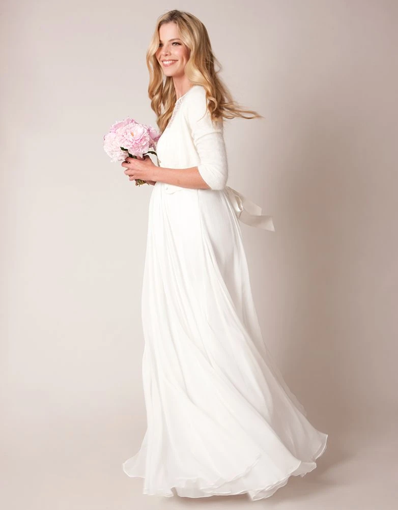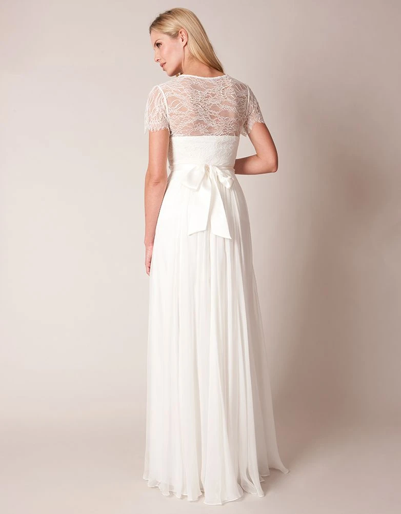Cette robe de mariée grossesse fluide et longue est ornée d’une délicate dentelle sur le décolleté et les épaules. Sa taille empire est soulignée par une large ceinture satinée. La longueur de la robe et sa taille empire affinent la silhouette et sa matière fluide la rend très agréable à porter. Une robe parfaite pour les occasions très spéciales.