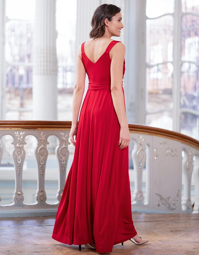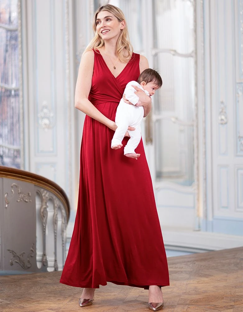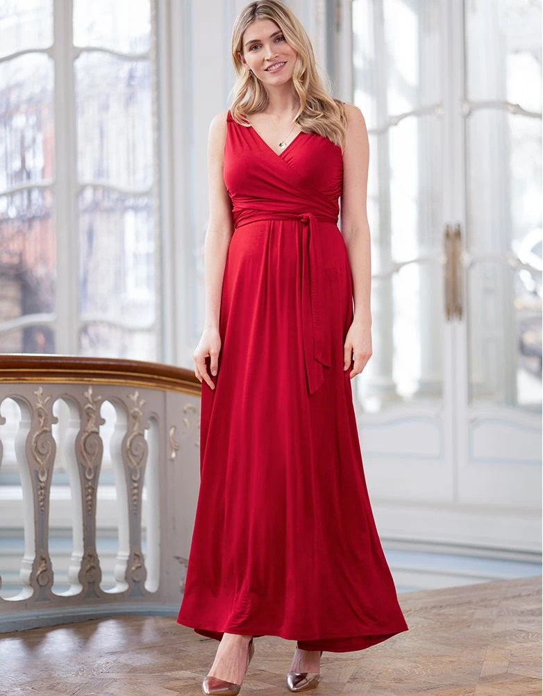 Soyez éblouissante en toutes occasions avec notre robe de soirée grossesse et allaitement rouge. Réalisée dans un joli drapé de qualité, cette robe longue grossesse épousera magnifiquement vos nouvelles courbes de femme enceinte. Le joli décolleté façon cache-cœur, permet un accès discret pour allaiter et son cordon intégré à attacher dans le dos vous feront une magnifique taille empire.