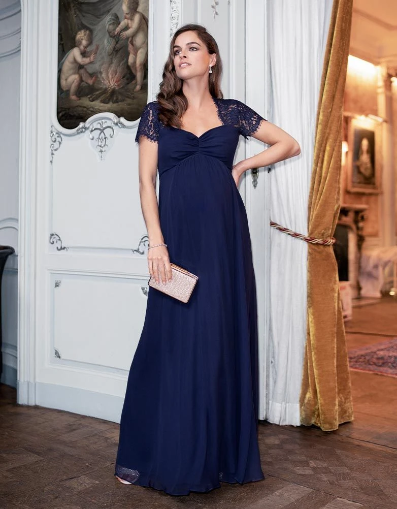 Vous serez la plus belle ce soir vêtue de notre robe de soirée soie et dentelle bleu marine. En pure soie, le tissu drape parfaitement vos courbes de femme enceinte et tombe en cascade – vous serez divine ! Réhaussée d’un col bustier qui sublime votre silhouette, elle présente un dos légèrement ouvert et tout en dentelle jusqu’aux épaules donnant un côté sensuel. Une bande stretch dans le dos permet une élasticité confortable pour que la robe soit parfaitement adaptée à votre silhouette changeante avant, pendant et après la grossesse. Derrière la robe nous avons une fermeture à zip dissimulée pour l’enfiler facilement, cette robe sera une pièce élégante et chic à avoir dans votre garde-robe grossesse.
