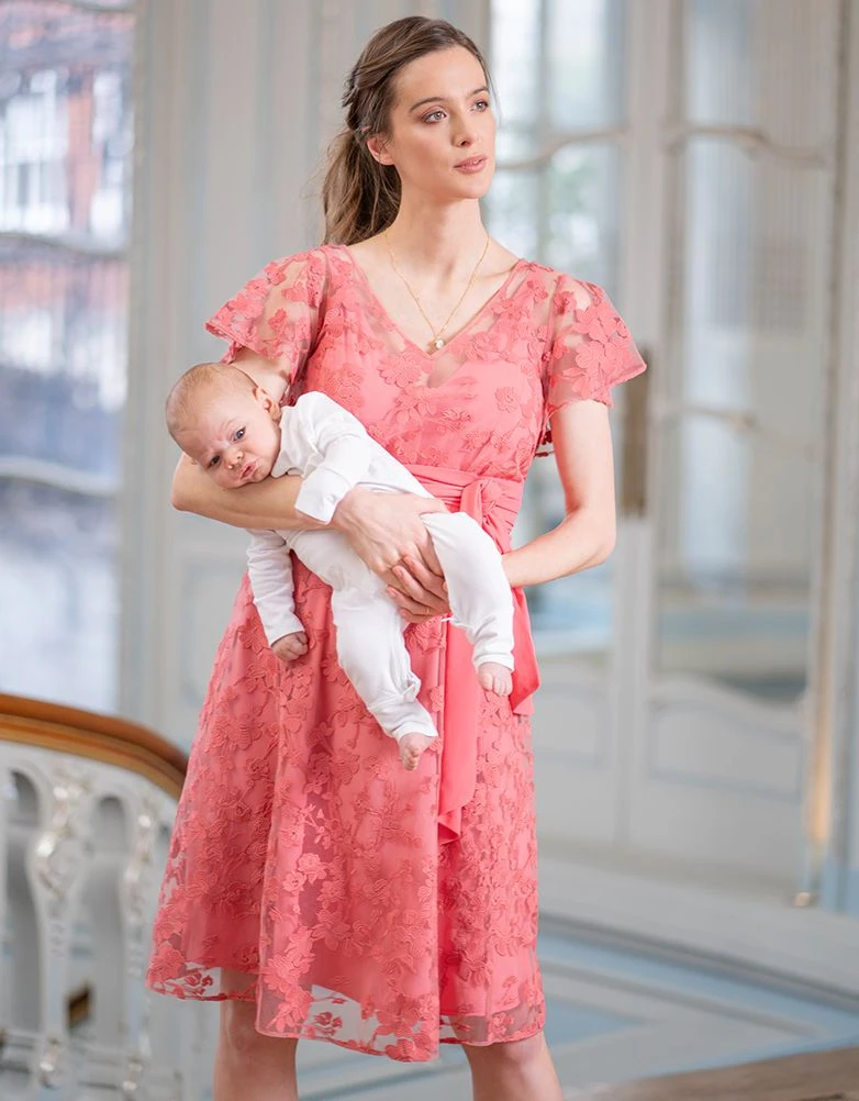 Seraphine Robe En Dentelle Florale De Grossesse à Allaitement Rose Corail