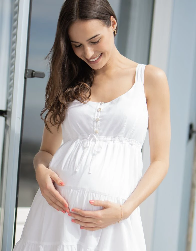 Complétez votre garde-robe de future maman avec notre jolie robe de maternité brodée. Entièrement en coton et doublée, cette robe femme enceinte blanche vous sublimera durant tout l’été. La bande stretch dans le dos vous permettra de la porter tout au long de votre grossesse et le cordon à nouer à la taille soulignera votre taille empire. Vous craquerez pour ses broderies qui donnent au look une allure féminine et tendance. Les boutons en nacre vous permettront d’allaiter en toute discrétion et simplicité.