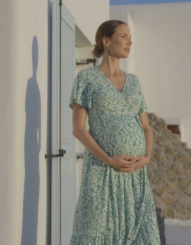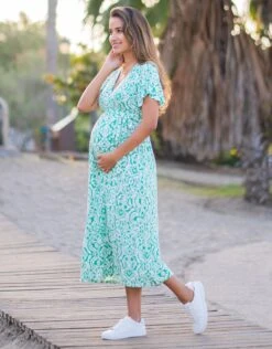 L’article phare de cette saison, notre robe grossesse cache-cœur aztèque verte, est conçue pour s’adapter et flatter votre silhouette à chaque étape de votre grossesse. Fabriquée en viscose LENZING™ ECOVERO™ ultra-douce, elle est douce et extensible comme du jersey, mais se drape sur votre corps et bouge comme un modèle tissé de qualité supérieure – vous obtenez le meilleur des deux mondes ! Le modèle cache-cœur classique flatte votre taille empire et garantit une coupe facile à régler – parfait pour votre ventre qui s’arrondit en fonction de l’état de votre grossesse. Les manches volantées apportent une finition féminine et couvrent bien les bras. Dans la teinte de vert la plus chaude de cette saison avec un imprimé aztèque élégant, ce modèle est parfait pour se mettre sur son trente-et-un ou s’habiller décontracté.