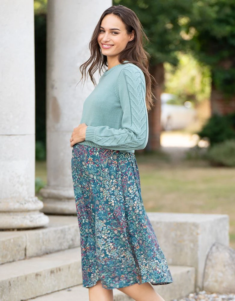 Mignonne, confortable et vraiment polyvalente, notre robe 2 en 1 au motif cachemire vert cendré est une option seyante pour la grossesse, l’allaitement et bien plus encore. La jupe tissée ultra-douce drape magnifiquement vos courbes changeantes tout au long de la grossesse. Après l’arrivée de bébé, vous n’aurez qu’à soulever le tricot 100 % coton pour révéler un corsage intégré en jersey, qui vous permettra d’allaiter ou de tirer votre lait, où que vous soyez. Mieux encore, ce tricot douillet est entièrement amovible, afin que vous puissiez mélanger et assortir la robe à d’autres hauts, selon votre style personnel. L’imprimé cachemire bohème et les grosses torsades complètent parfaitement ce look.