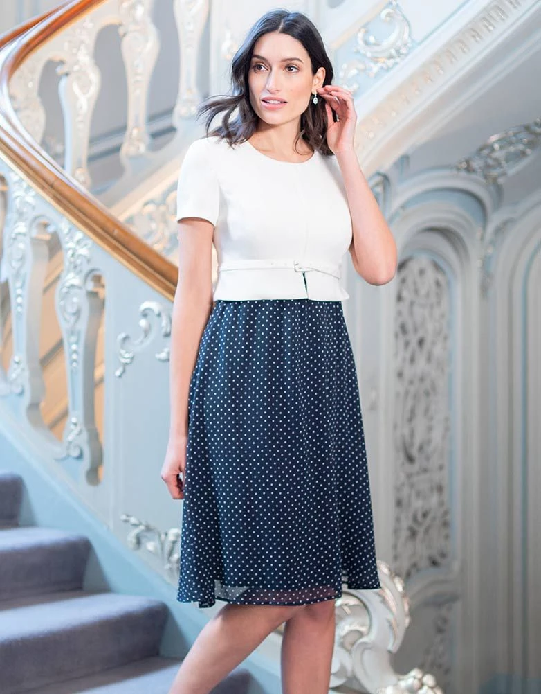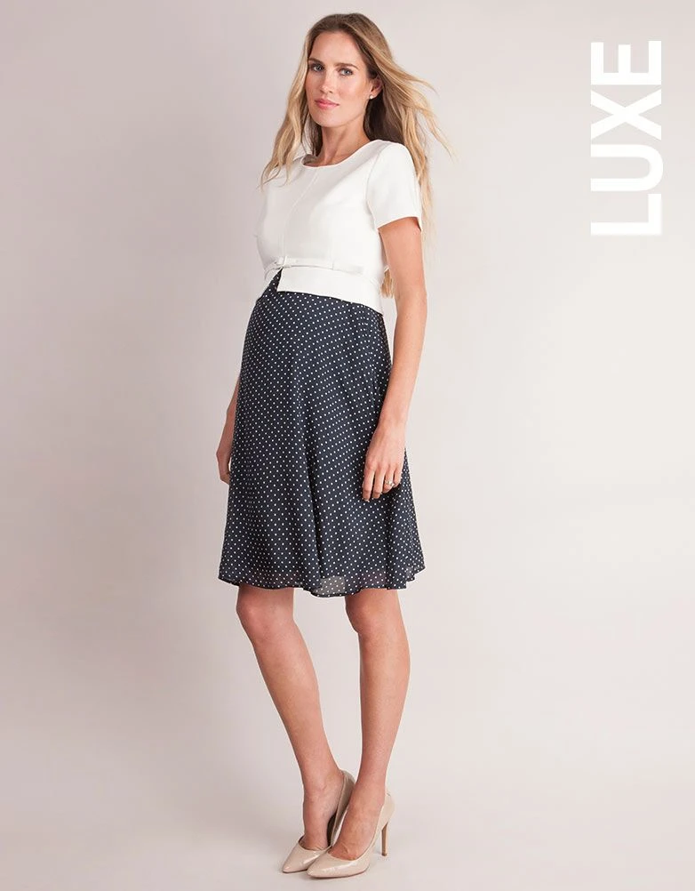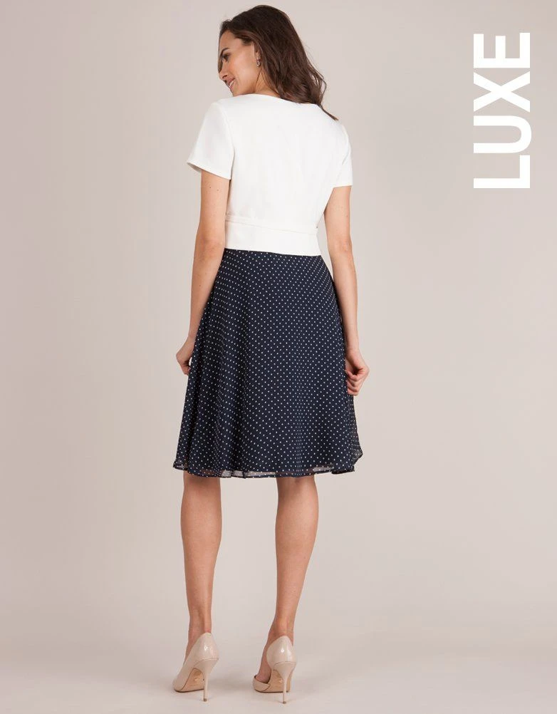 L’occasion de s’apprêter n’a pas à être une chose difficile pendant votre grossesse ou même après ! Cette superbe robe grossesse bleu marine vous est une option parfaite pour vos belles occasions. Elle fera également la transition parfaite une fois bébé né grâce à ses accès pour allaiter bébé en toute simplicité. La jupe en soie doublée a été réalisée afin de dessiner avec élégance vos nouvelles formes de femme enceinte tandis que le haut en maille Ponte définira votre taille empire. En bleu marine, cette robe femme enceinte est un classique.