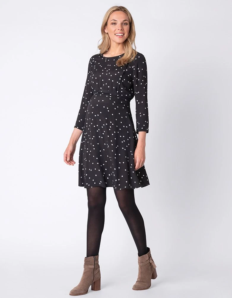 Classique, facile à porter et un accès allaitement discret, cette robe de grossesse et allaitement noire à tout pour vous plaire. Conçue dans une viscose tissée douce et légèrement élastiquée au dos, cette robe sublime votre silhouette avec une ceinture optionnel à la taille, portant toute l’attention sur votre point le plus mince. Après la naissance de bébé, cette robe sera parfaite pour vous aider à allaiter bébé en toute discrétion grâce à l’ouverture en zip sur le devant. À porter avec des collants noirs et des bottes pour un look décontracté, mais chic.